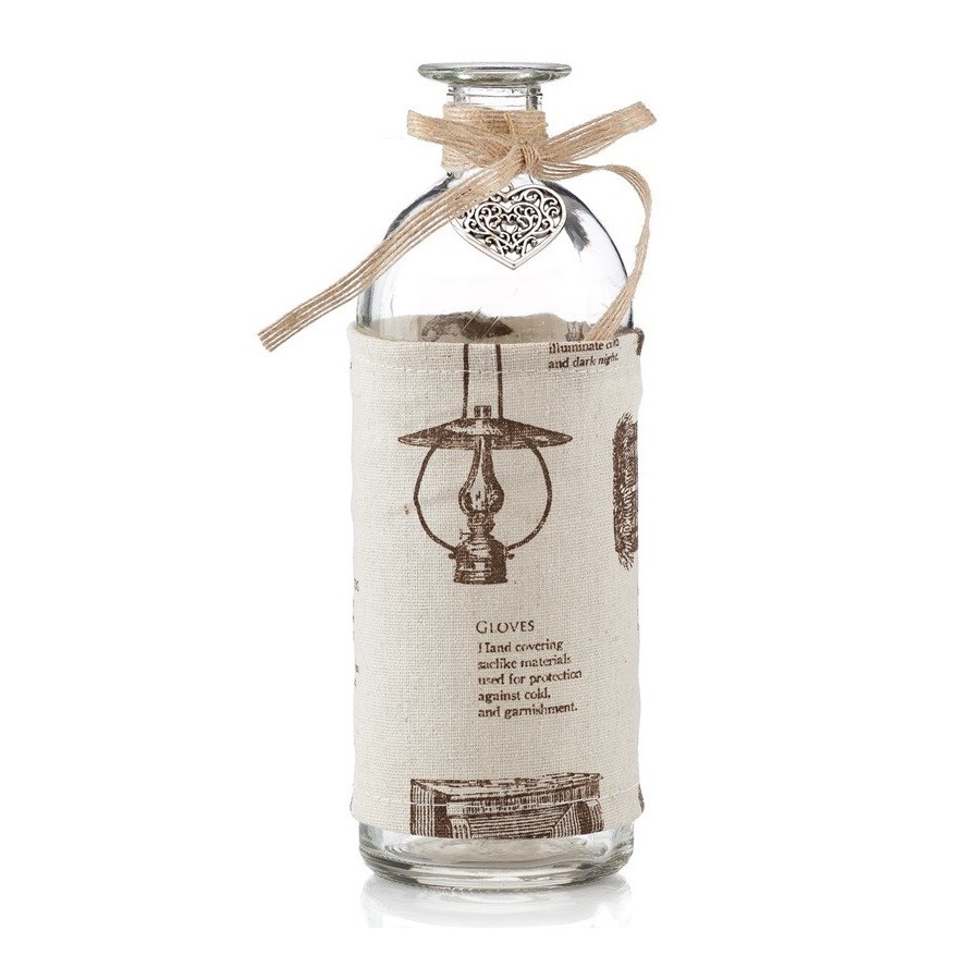 Eleganckie ozdobne butelki to fantastyczne dodatki do każdego wnetrza. Butelka ozdobna obszyta jest beżowym materiałem z nadrukowanymi grafikami, na przewężeniu natomiast znajduje się sznurkowana kokardka z metalowym serduszkiem.