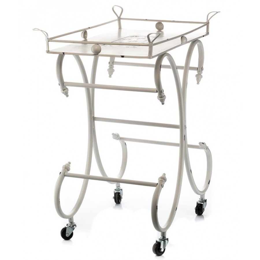 Rewelacyjny metalowy stolik na kółkach to niezbędny element dużego tarasu, balkonu czy klimatycznego wnętrza. Może służyć jako stolik, jako wygodny stolik taca czy jako półka na kółkach. Jasny kolor ze stylowym otarciami stwarzającymi wrażenie jego niemłodego wyglądu, ozdobne wycięcia w blacie z motywem kwiatowym oraz dekoracyjna obramowanie sprawią, że stolik na kółkach, tak jak inne meble ogrodowe, będzie stałym gościem na salonach.