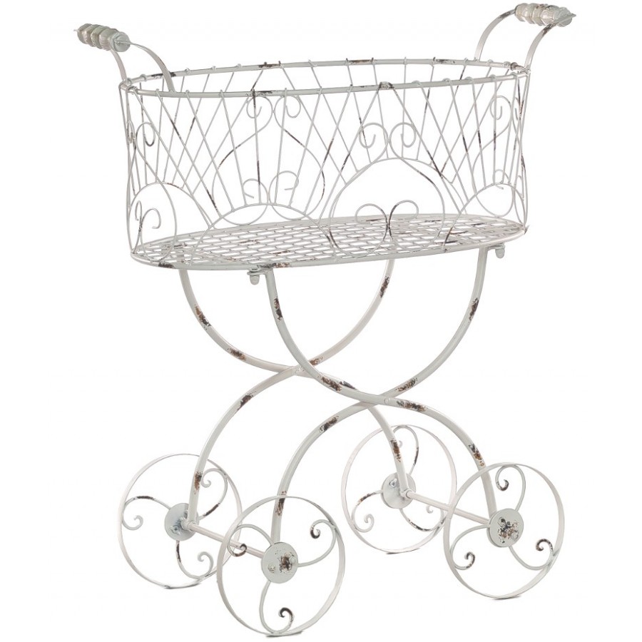 Wykonany z dbałością o szczegóły, wsród których znajdują się takżę stylowe przetarcia, które mają za zadanie stwarzanie wrażenia starości, metalowy kwietnik do ogrodu czy na taras. Wykonany na podobieństwo wóżka na czterech kołach, z ażurowymi zdobieniami z motywem serc. Wyjątkowo praktyczny i stylowo romantczny!