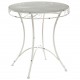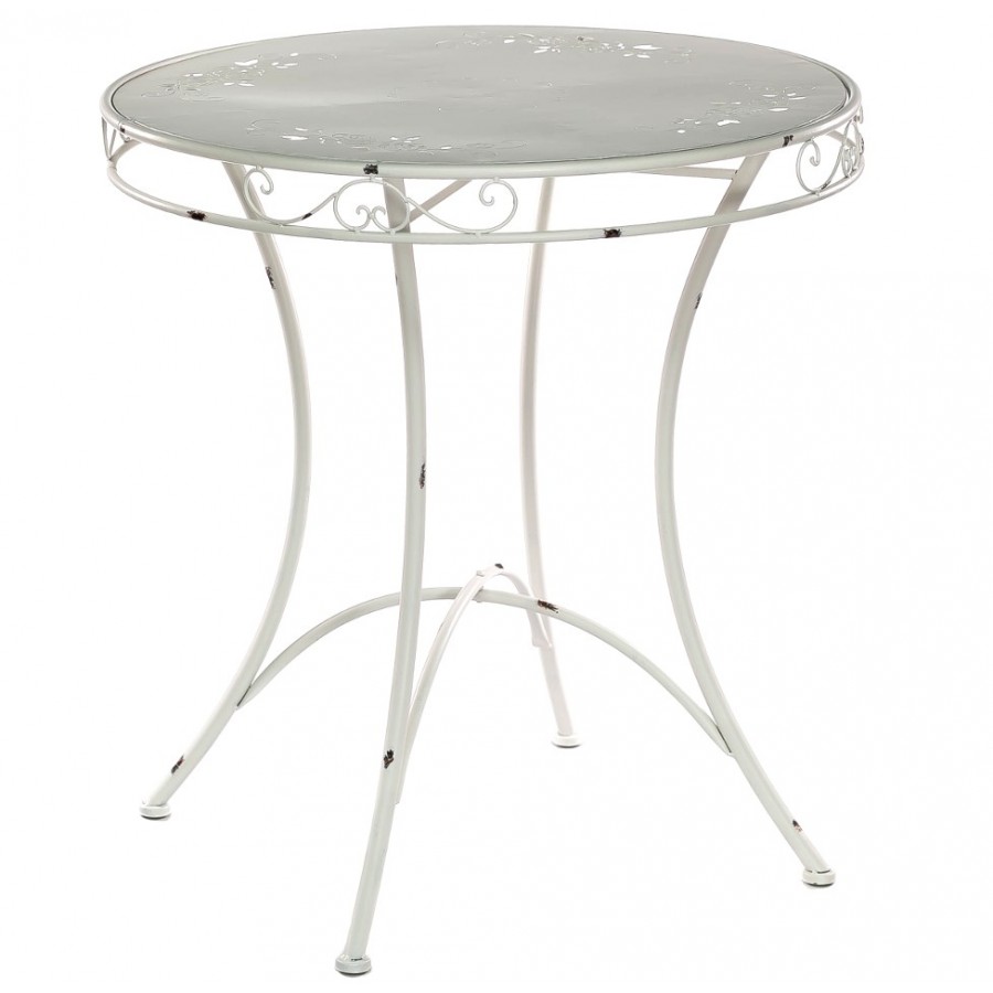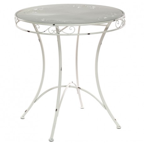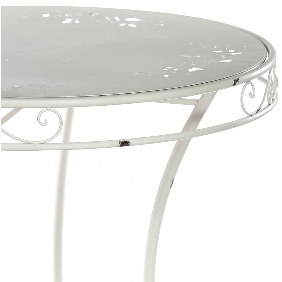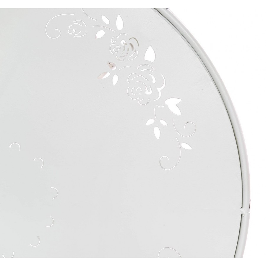 Biały, okrągły stolik metalowy z kolekcji Bertoni marki Aluro z pięknie ukształtowaną podstawą utworzoną ze stylowo uformowanych prętów. Zachwycający blat posiada symetryczne wycięcia w kształcie różanych kompozycji. Dodatkowym elementem jest podwieszane rondo dekoracyjne z delikatnymi zdobieniami.
