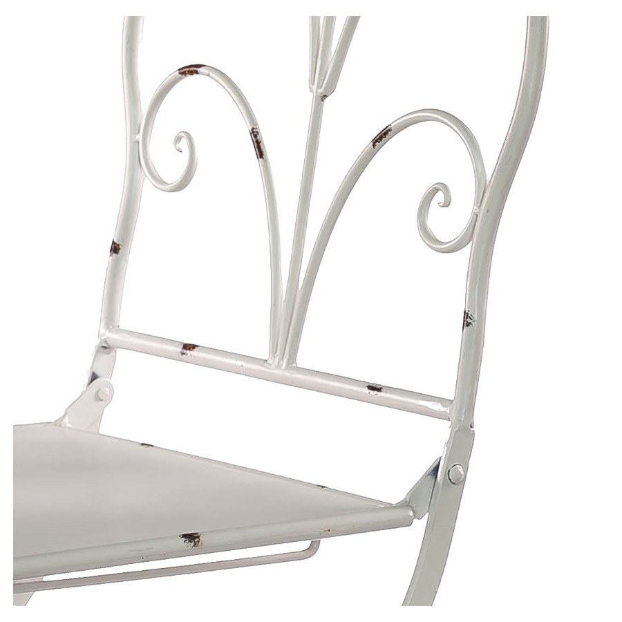 Wygodne, składane metalowe krzesła ogrodowe, które mogą służyć także na balkonie czy na tarasie. Biały kolor z celowymi otarciami na krawędzaich oraz zdobne opracie tworzą niezapomniane wrażenie wizualne, a jednocześnie ich uniwersalność nie przeszkodzi w dopasowaniu do nich pozostałych dodatków.