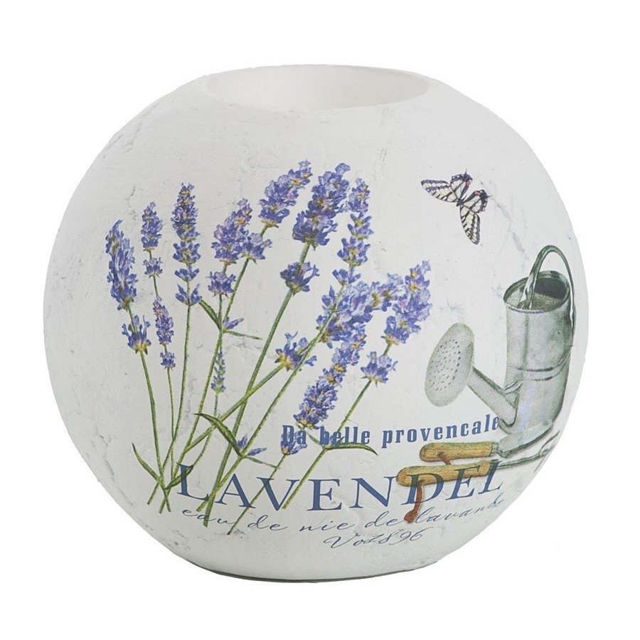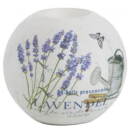 Oferowany świecznik prowansalski to świecznik na świece typu tea light, bardzo stylowy i efektowny. Kształt kuli i graficzne elementy w klimacie prowansalskim, m.in. kwitnąca lawenda, motyl czy napisy w języku francuskim sprawiają, że świecznik z lawendą to niepowtarzalny element wystroju.