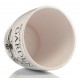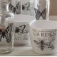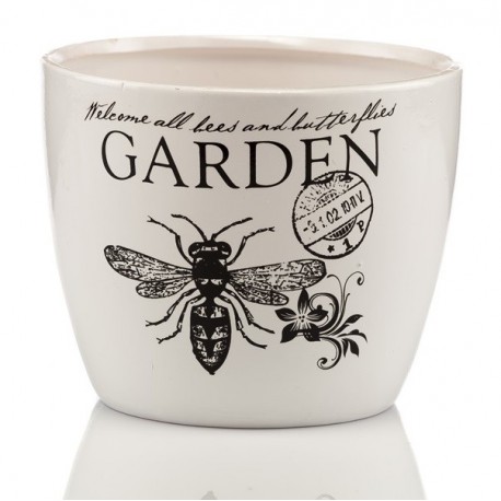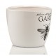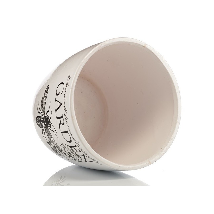 Okrągłe, delikatnie zwężane ku dołowi osłonki w stylu prowansalskim, ozdobione na frontowej ściance prześliczna grafiką ważki i stempla, na tle napisów w języku angielskim. Ceramiczne osłonki świetnie sprawdzą się na domowym parapecie, jako zdobne osłonki w lokalu czy na tarasie.