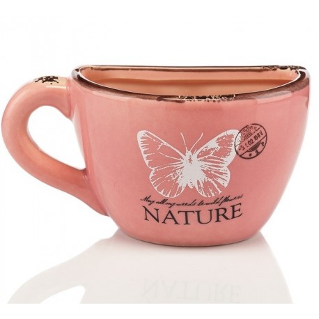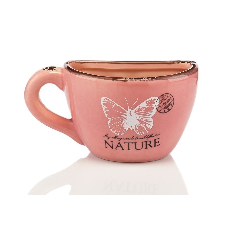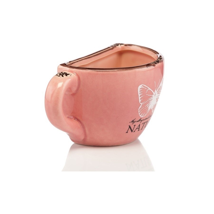 Ceramiczne osłonki w pastelowym odcieniu różu, z dużym napisem NATURE i białą podobizną motyla to doskonałe rozwiązanie, gdy szukasz odmiany dla wyglądu Twojego małego ogródka. Piękny, nietypowy kształt jak na osłonki na doniczki, wyróżniający się i kontrastujący z zielenią kolor, nawiązujący do natury wzór, cóż więcej pomoże Ci zerwać z nudą na parapecie?
