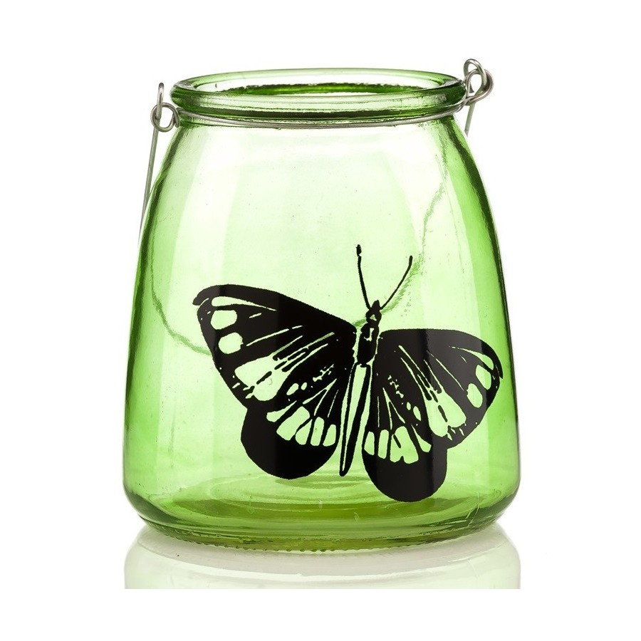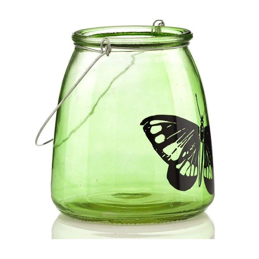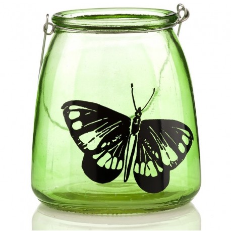 Niezwykłej urody szklane lampiony w delikatnym odcieniu zieleni, z poręcznym, metalowym uchwytem, który z pewnościa ułatwi przenoszenie lamppionu czy współne z nim wędrowanie po ogrodzie. Cechą charakterystyczną, wyróżniającą ten szklany lampion jest motyw dużego motyla na ściance, który od razu przywołuje styl prowansalski.