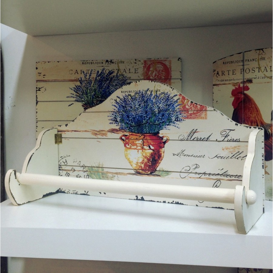Wprowadzający prowansalską atmosferę wieszak na papier, wykonany z drewna, pomalowany na biało, z celowymi otarciami farby, tworzącymi dopełnienie stylu. Motyw lawendy rozświetli wnętrze, a Ty już nigdy nie będziesz miała problemu z szybkim oderwaniem papieru z rolki.