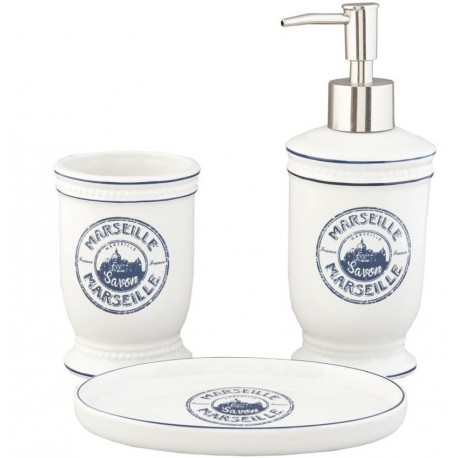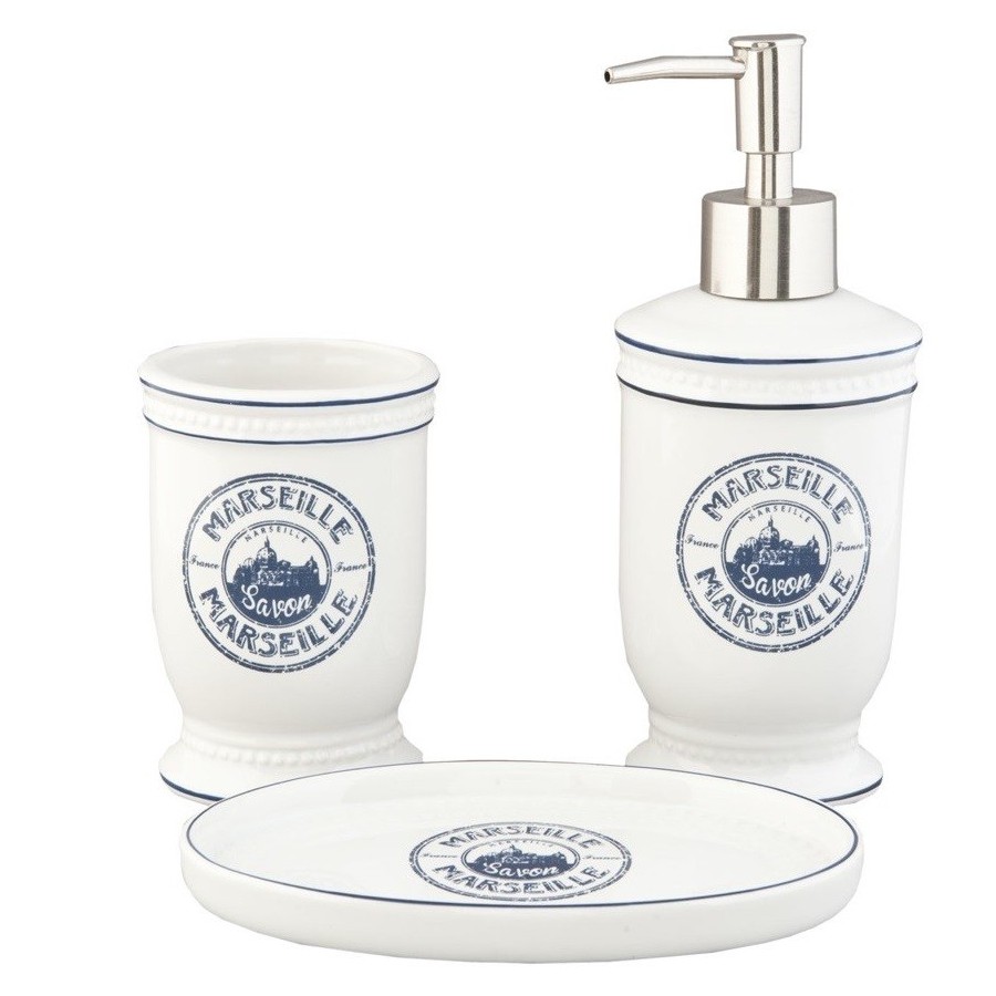 Utrzymany w klasycznych marynistycznych kolorach bieli i błękitu trójelementowy zestaw łazienkowy Marseille!