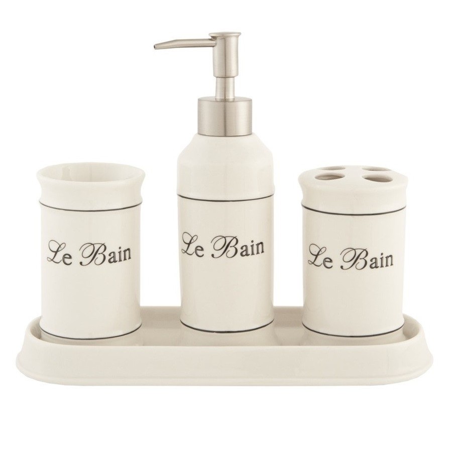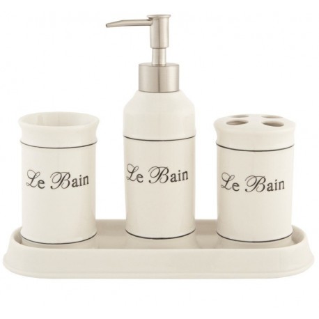 Niesamowite dodatki w stylu prowansalskim czyli piękny zestaw łazienkowy składający się z pojemnika na mydło w płynie, pojemnika na szczoteczki do zębów i kubka ustawionych na specjalnie dopasowanej podstawce. Zestaw łazienkowy Le Bain to połączenie elegancji, minimalizmu i klasycznego wykończenia.