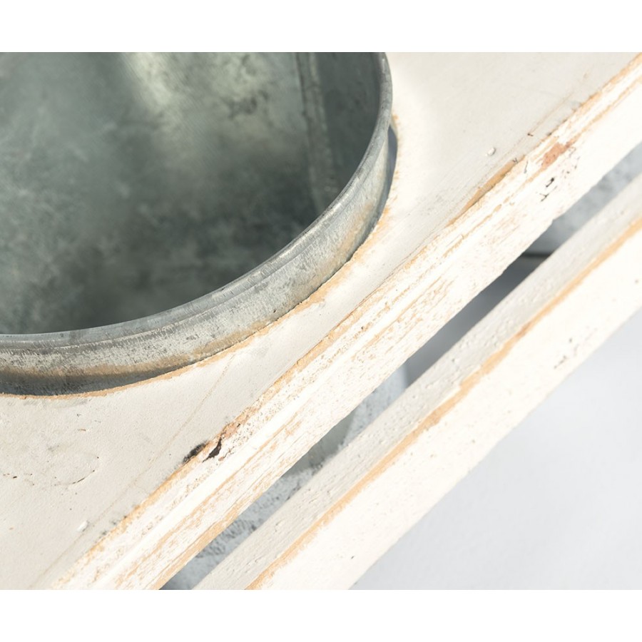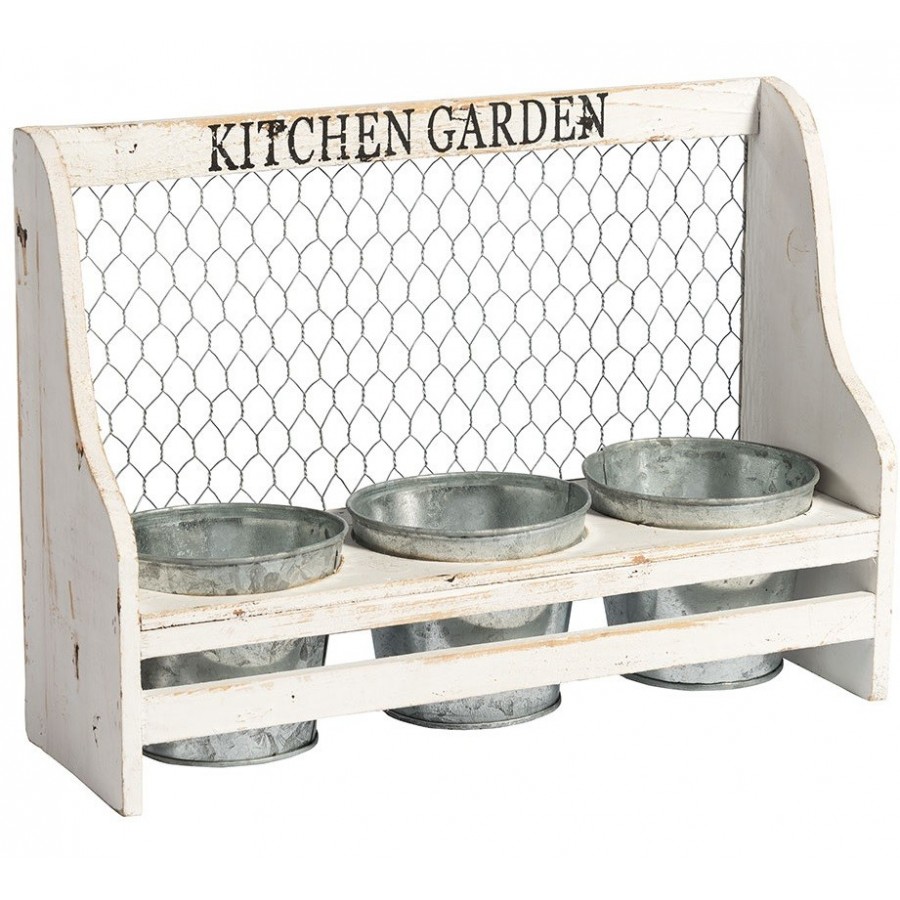 Osłonki Belldeco wykonane zostały z metalu i są doskonałym miejscem na postawienie w nich świeżych przypraw. Osłonki metalowe to trzy sztuki pojemników osadzonych w białej, drewnianej półeczce. Firma Belldeco stworzyła półeczkę w oryginalnym, postarzanym stylu, z dużym czarnym napisem na górze KITCHEN GARDEN.