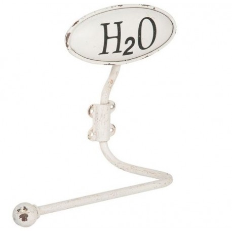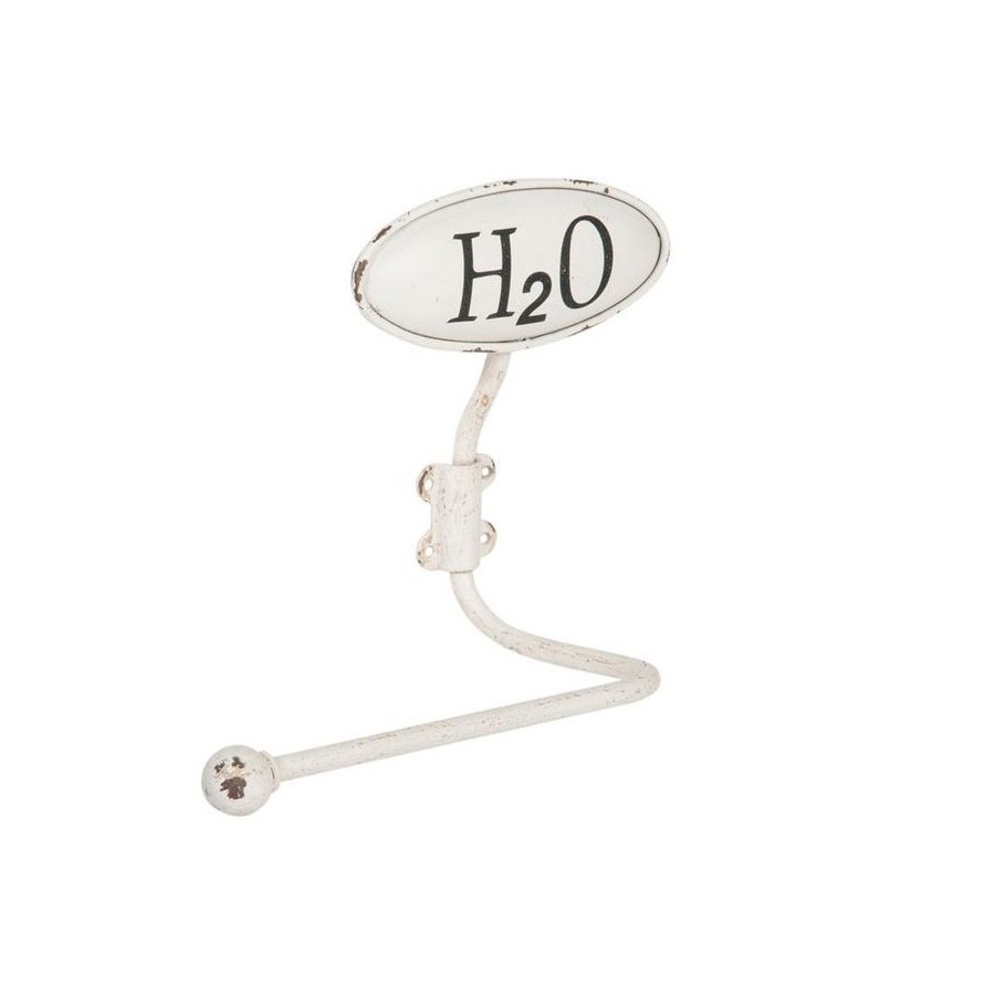 Metalowy uchwyt na papier toaletowy ozdbiony owalną tabliczką z wypisanym wzorem chemicznym na wodę czyli H2O. Celowe odpryśnięcia farby nadają wieszakowi prowansalski klimat, pobudzając wyobraźnię do działania. Jeśli zawsze marzyłeś, aby Twoja łazienka wyglądała stylowo i gustownie to prezentowany wieszak na papier jest właśnie dla Ciebie!