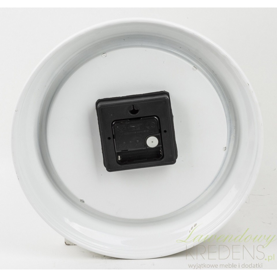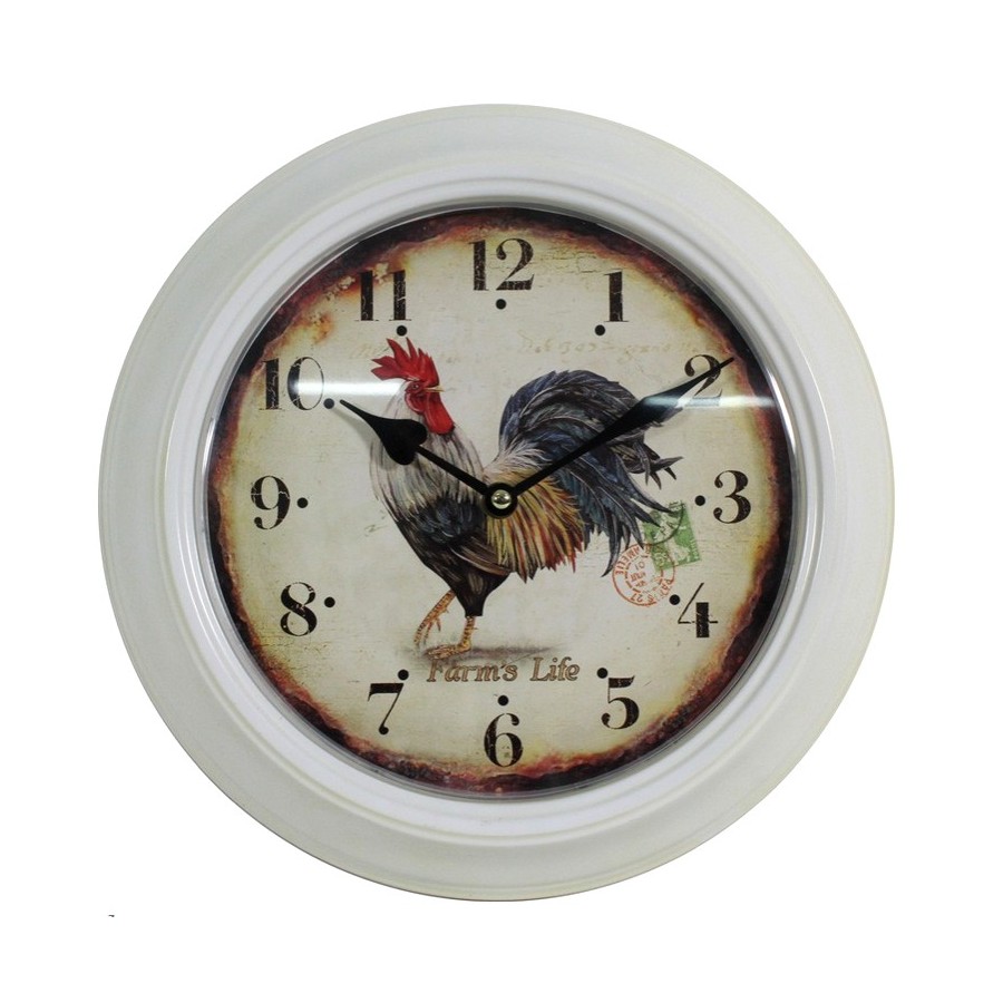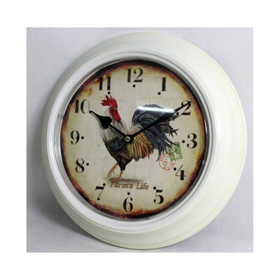 Prowansalski zegar ścienny wykonano ze szkła i metalu. Obudowa przedmiotu to okrągła rama w białym kolorze. Tarcza natomiast, ubarwiona jest na beżowo i brązowo. Na środku tarczy umieszczono wizerunek pięknego koguta z pokaźnym grzebykiem. Dodatki prowansalskie - polecamy!