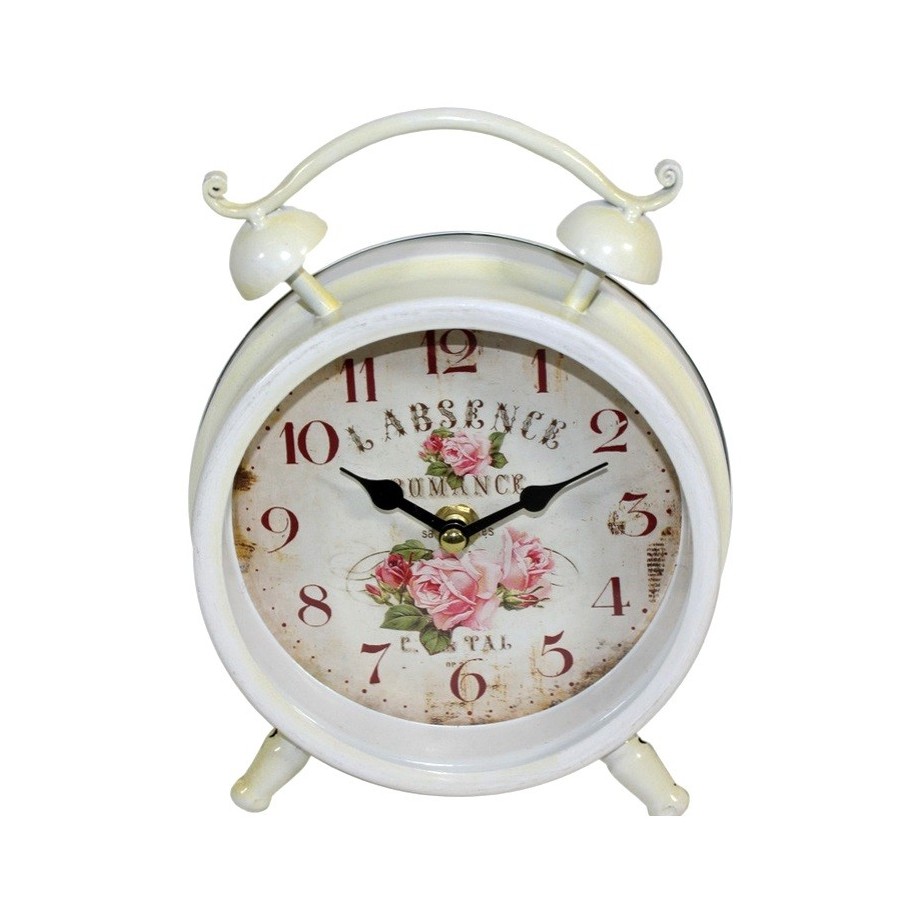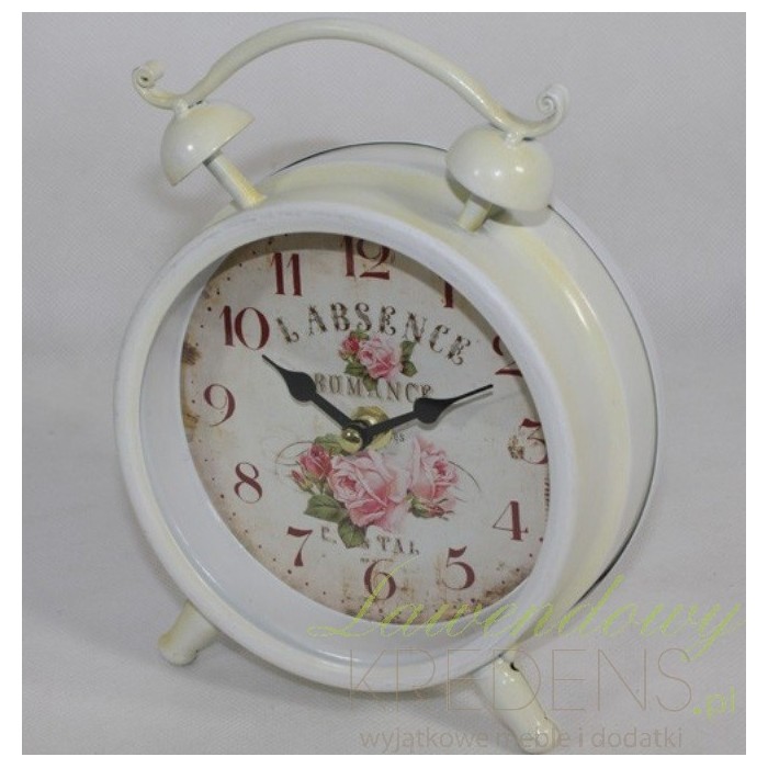Zegar stojący w kształcie budzika stanowi piękny element dekoracyjny mieszkania. Na okrągłej tarczy umieszczono wizerunek róż oraz delikatny napis. Wskazówki są bardzo zgrabnie wycięte - doskonale spełniają swoją funkcję. Zachęcamy!