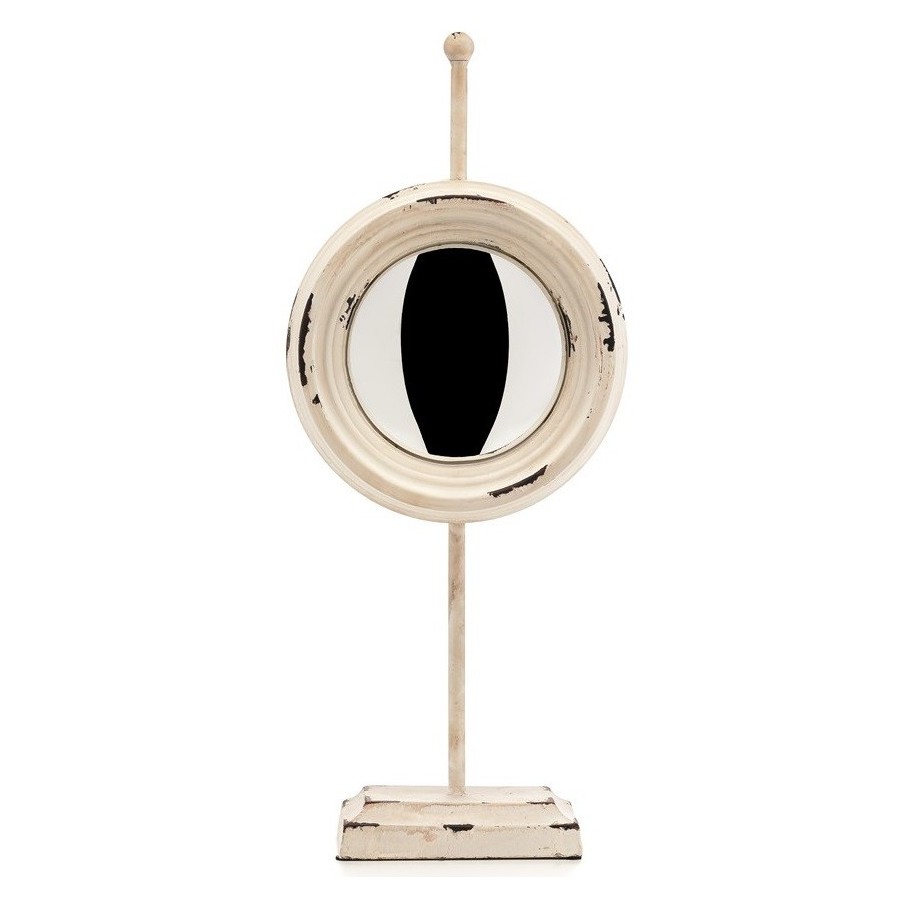 Ozdobne lustro w kolorze antycznej bieli z widocznymi fragmentami celowo poocieranymi i zadrapanymi, aby nadać całości charakteru sprzed wielu lat. Metalowa obudowa wraz z podstawą i cienką nóżką stanowi doskonale współgrające tło dla lustra typu rybie oko, które daje ciekawy obraz odbitej przestrzeni.