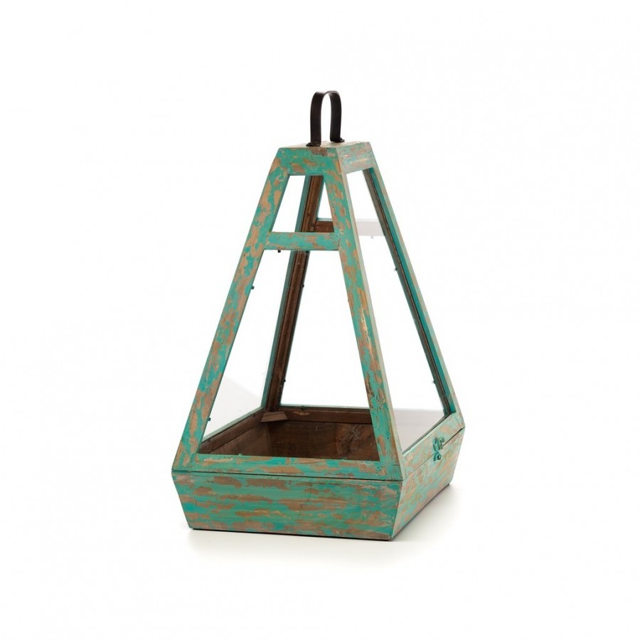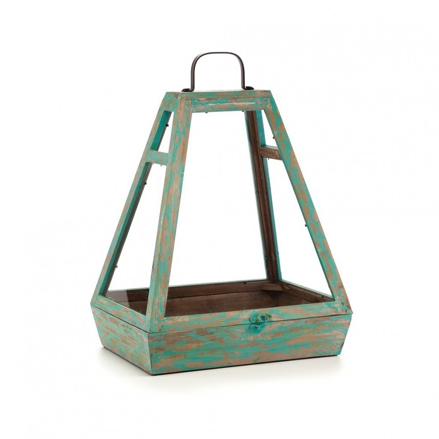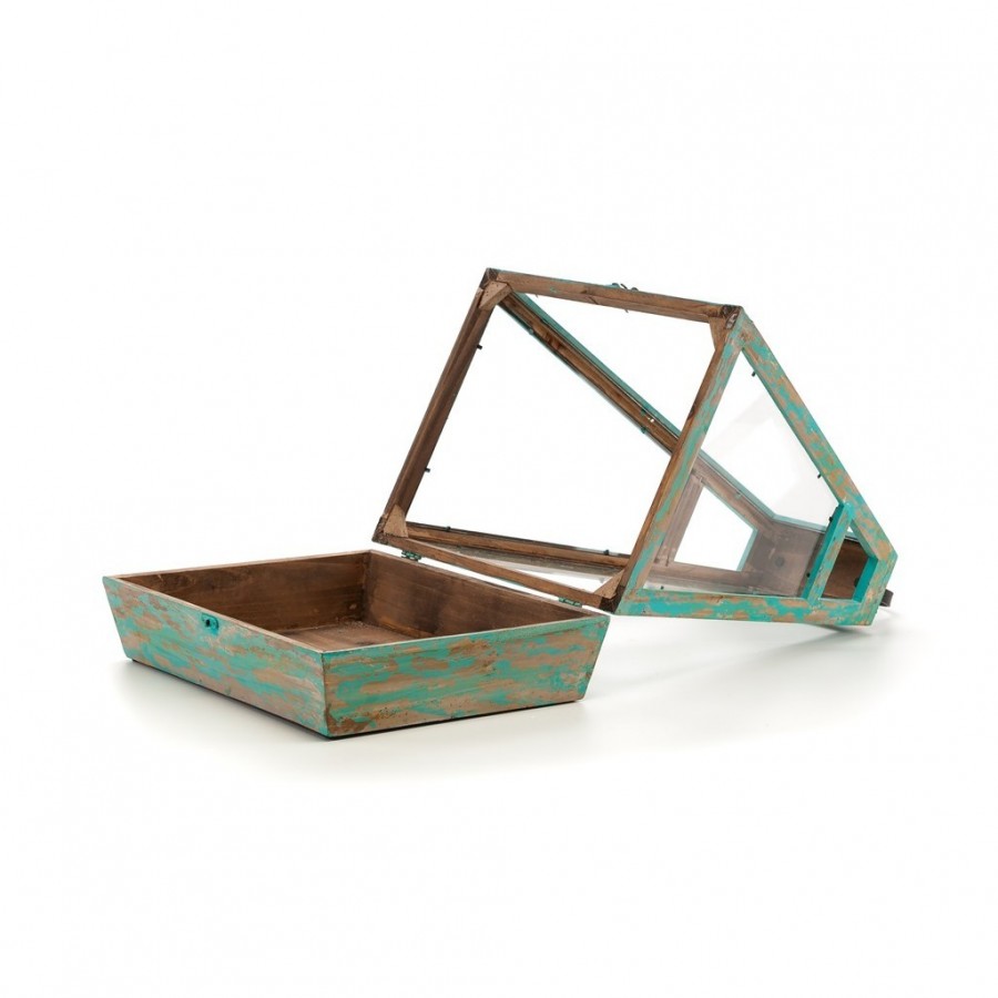 Nietypowego kształtu szklarenka wykonana z drewna i szkła w kolorze turkusowym z wygodnym uchwytem. Polecamy!