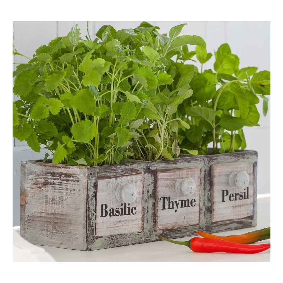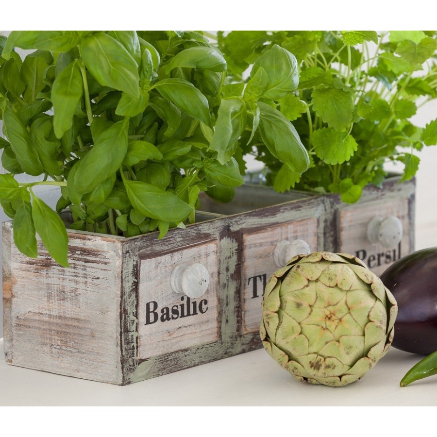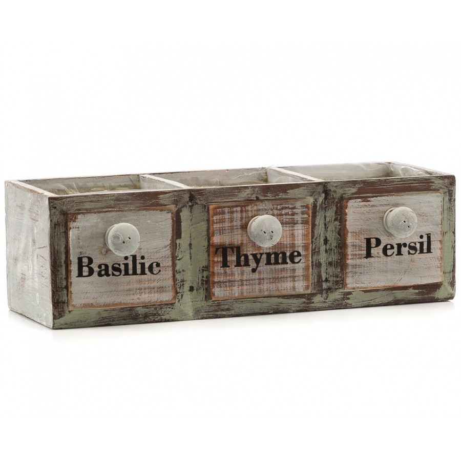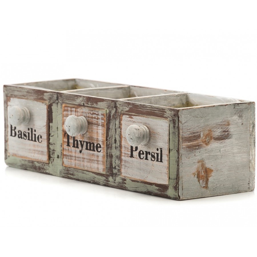 Potrójne osłonki na doniczki w kształcie podłużnej szuflady z trzema przegródkami. Każda z przegródek podpisana jest francuskimi nazwami ziół: bazylii, tymianku i pietruszki. Nie stoi jednak nic na przeszkodzie, abyś posadziła tam inne roślinki. Drewniana powierzchnia zabezpieczona została przed wilgocią za pomocą folii. Osłonki na doniczki Aluro - piękne i niestandardowe!