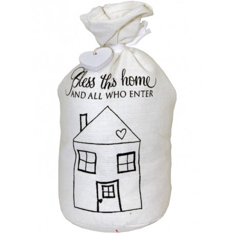 Wyjątkowe, białe stopery do drzwi z zabawnym rysunkiem domu, napisem w języku angielskim i drewnianym serduszkiem!