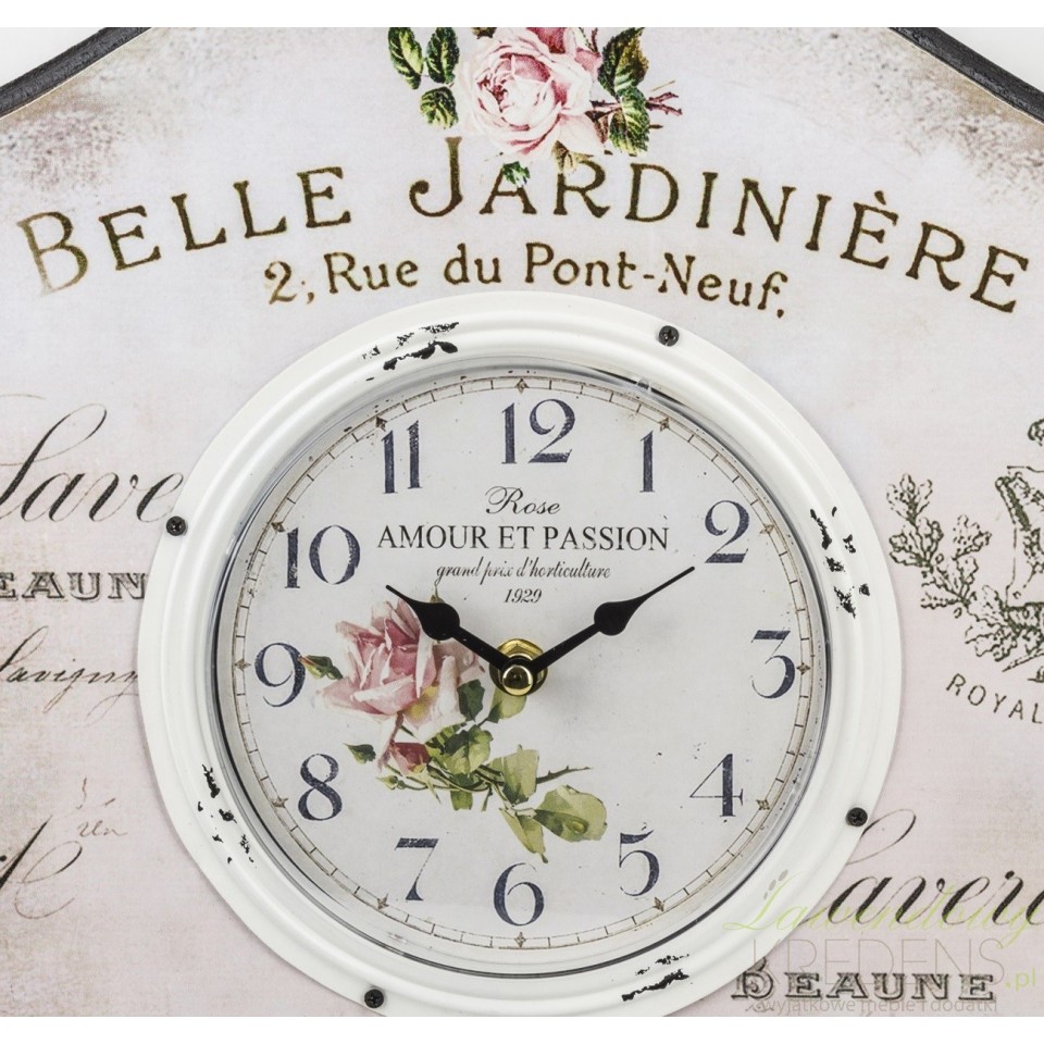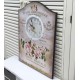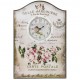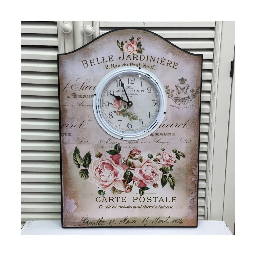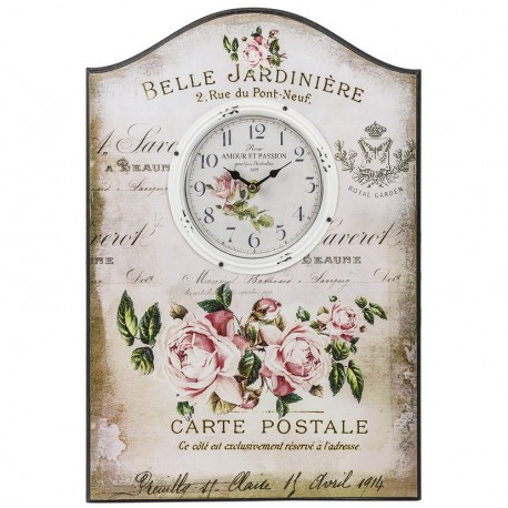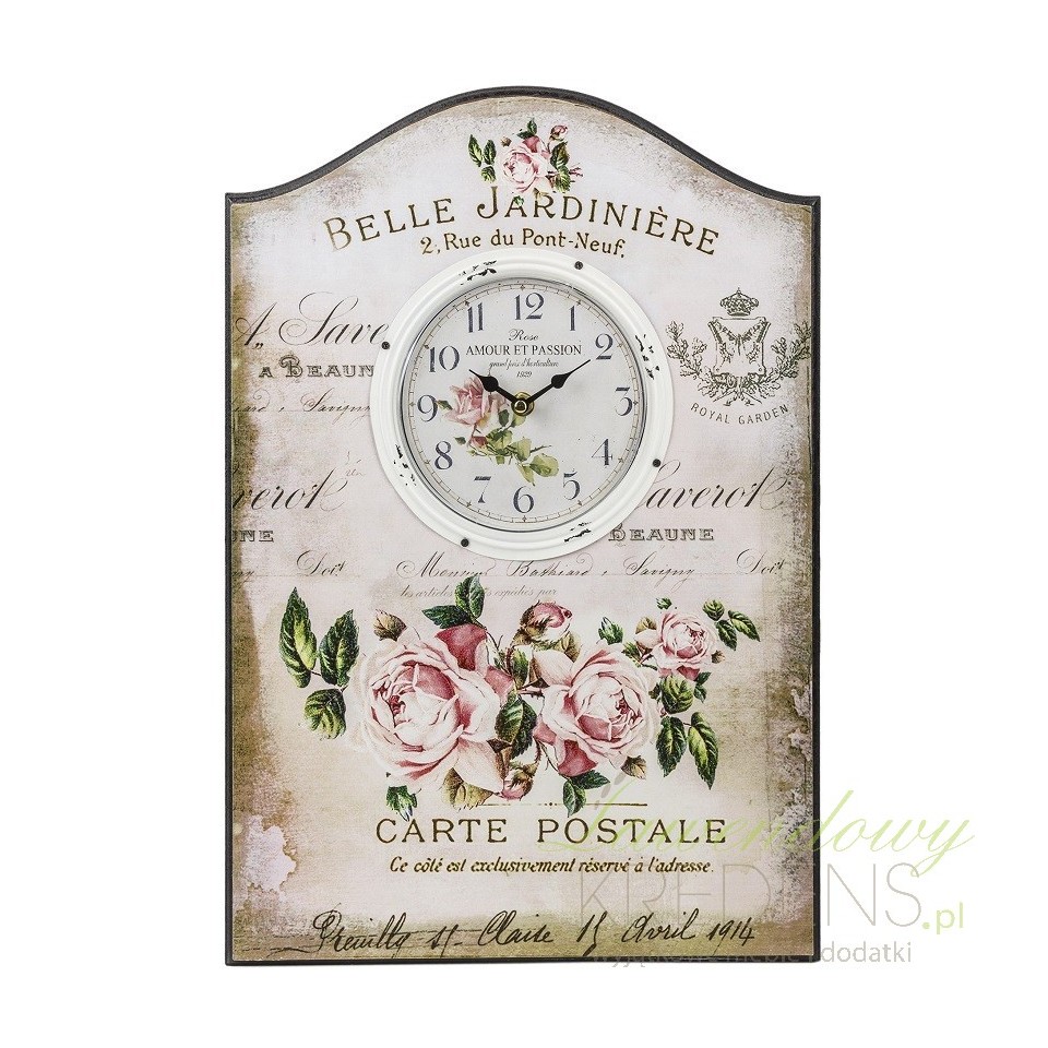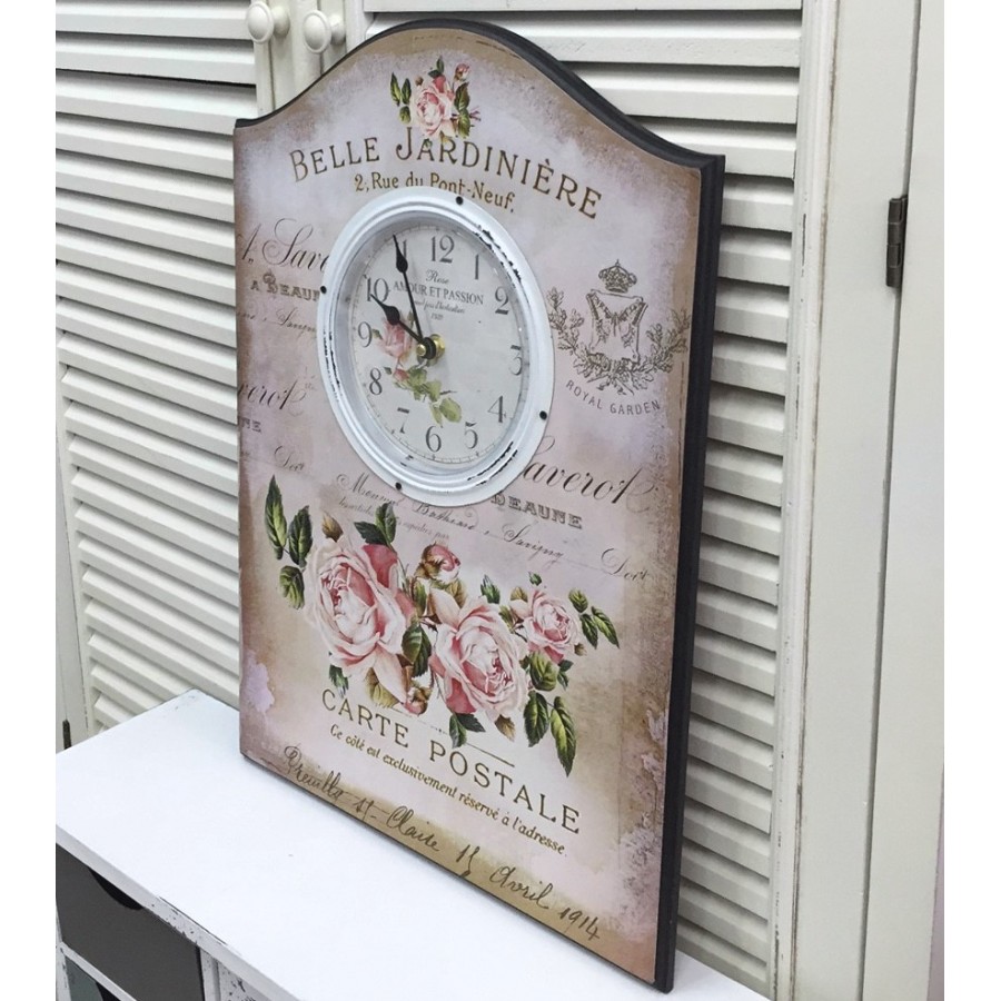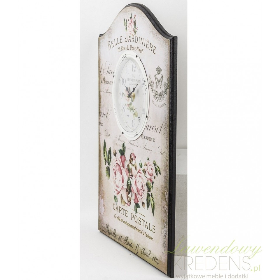 Zegary ścienne w stylu prowansalskim osadzone na drewnianej tablicy. Kompozycja kwitnących kwiatów róży, liczne stemple i znaczki, delikatne napisy imitujące adresy pocztowe i pozdrowienia w języku francuskim, a wszystko to na klimatycznym, miejscami przyciemnianym tle. Zegary ścienne które fantastycznie działają na wyobraźnie!