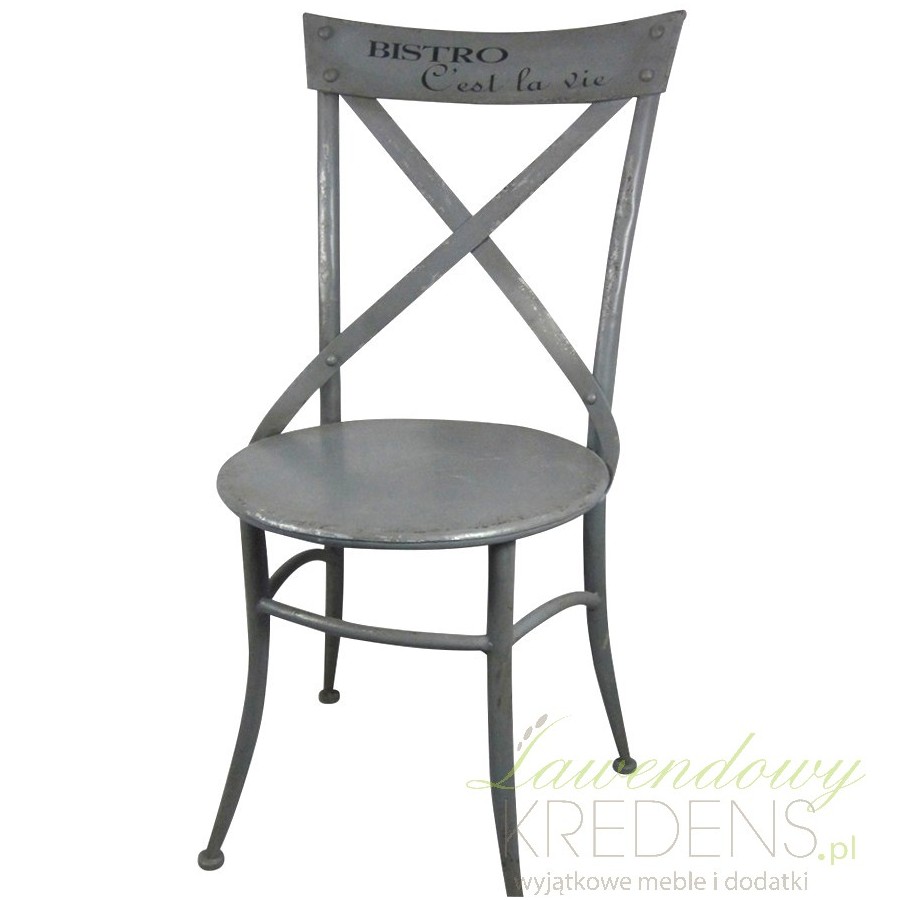 Typowe dla francuskich wnętrz kawiarni i ogródków, metalowe krzesło z napisem BISTRO. Zobacz koniecznie!