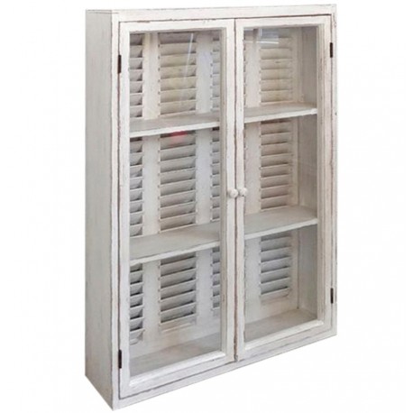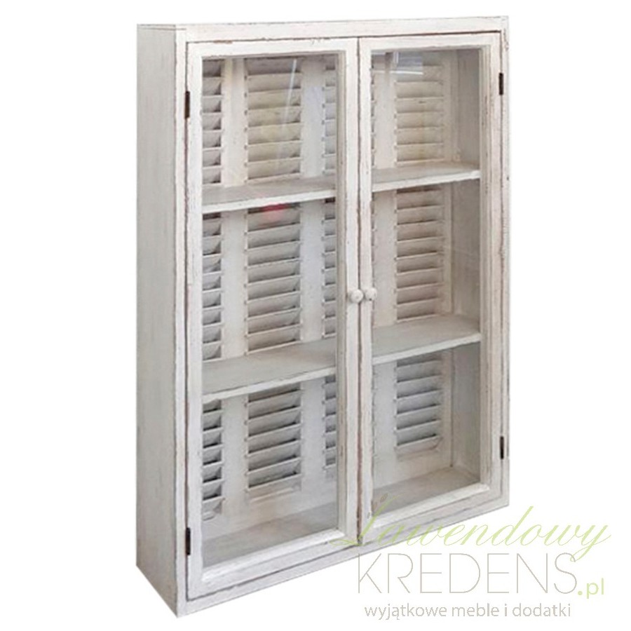 Dwuskrzydłowe szafki w stylu prowansalskim z trzema szerokimi półkami, zamknięte za przeszklonymi drzwiczkami. O niebanalnym wyglądzie szafki w stylu prowansalskim świadczy drewniana żaluzja, która jest jednocześnie wewnetrzną ścianką szafki! Ta innowacja w połączeniu z postarzaną, białą powierzchnią daje niezwykły efekt wizualny!