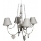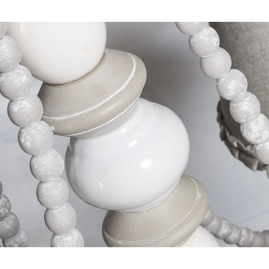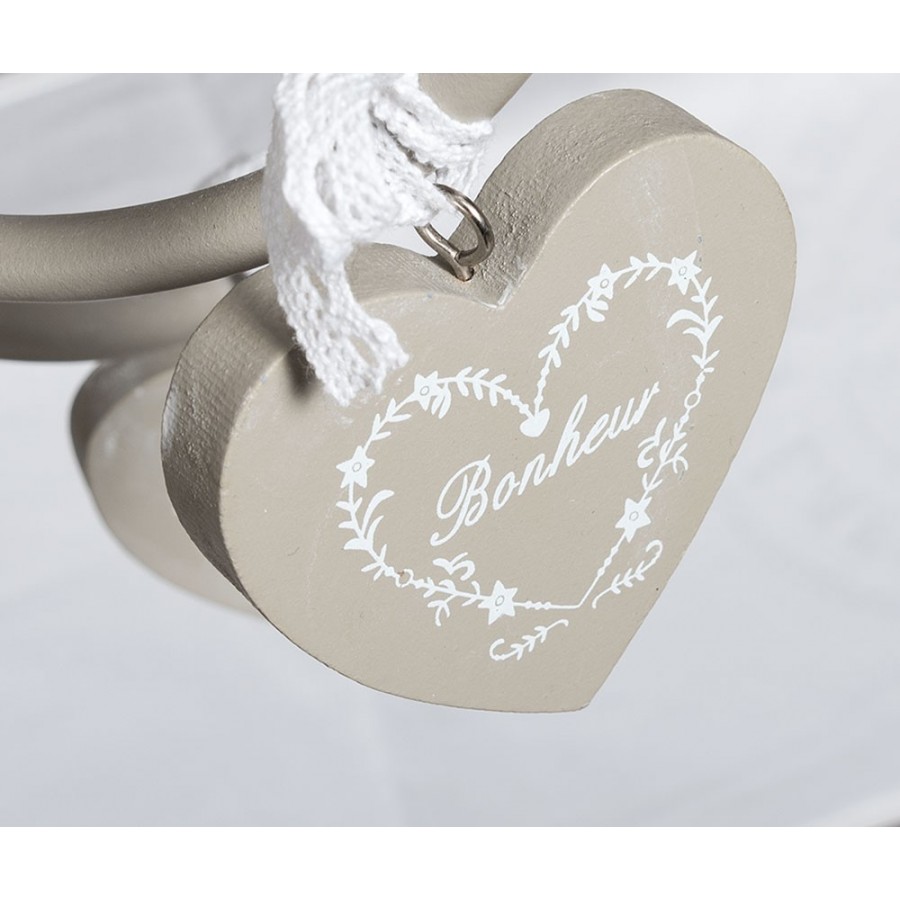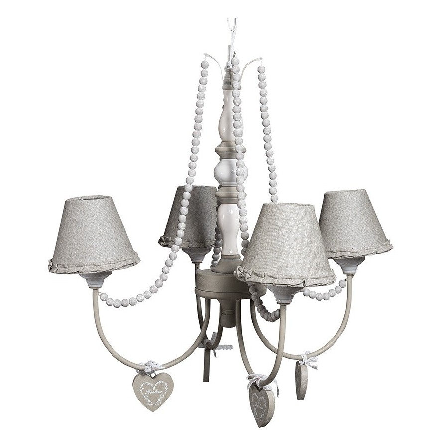 Piękny żyrandol w stylu prowansalskim w biało-szarym kolorze, którego cztery ramiona zostały wykonane z metalu i pomalowane na szaro. Na każdym z ramion zawieszone jest ozdobne serduszko na koronkowej wstążce. Abażury żyrandola Belldeco zostały zrobione z szarej bawełny, a w dolnej części ozdobione są uroczą falbanką. Całości dopełniają drewniane koraliki idące od górnej części żyrandola do każdego z czterech jego ramion. Żyrandole prowansalskie Belldeco wykonane są z dbałością o każdy szczegół i będą stanowiły cudowną ozdobę.