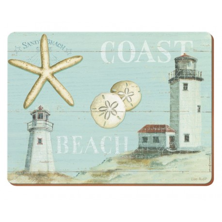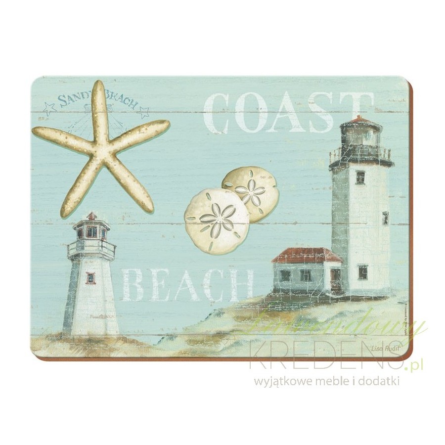 Kapitalne podkładki stołowe, to wykonane z korka podkładki, ozdobione marynistyczną grafiką przestawiającą dwie latarnie morskie i rozgwiazdę na tle delikatnego błękitu i napisów w języku angielskim. Doskonała kompozycja kolorów nadaje całości morskiego uroku, a lakierowana powierzchnia sprawia, ze podkładki można bez problemu czyścić wilgotna ściereczką!