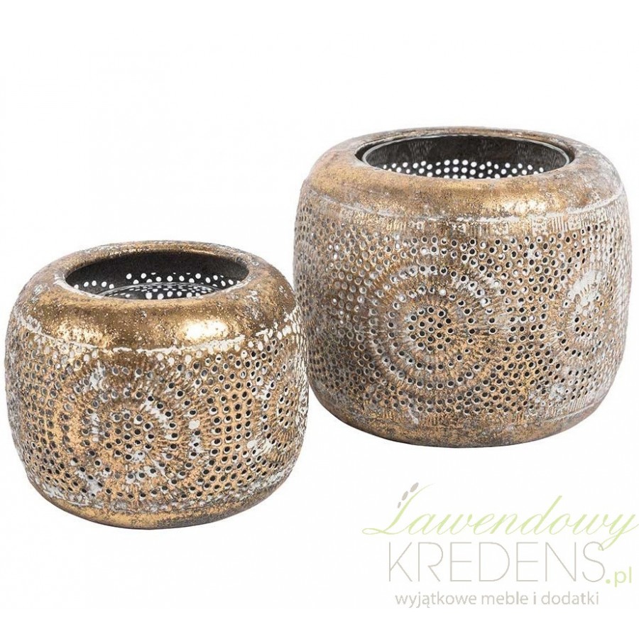 Metalowe lampiony od Belldeco wyróżniają antyczne postarzenia i ciekawe kształty. Ten ażurowy lampion Belldeco jest niewielkich rozmiarów, ale jego złoty kolor i ażurowe wykonanie spodobają Ci się o wiele bardziej niż masywne lampiony. Metalowy lampion ma delikatne bielenia i wewnątrz szklane naczynie na mały tealight.