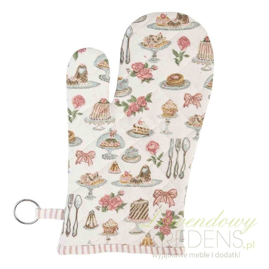 Cudownie wielobarwne rękawice kuchenne z malunkami przedstawiającymi słodkości, kwiaty i kuchenne sztućce. Bawełniany materiał obszyty został dodatkowo biało - różową lamówką, a rękawica jest wyposażona w specjalny metalowy, okrągły uchwyt, na którym można rękawice wygodnie powiesić.