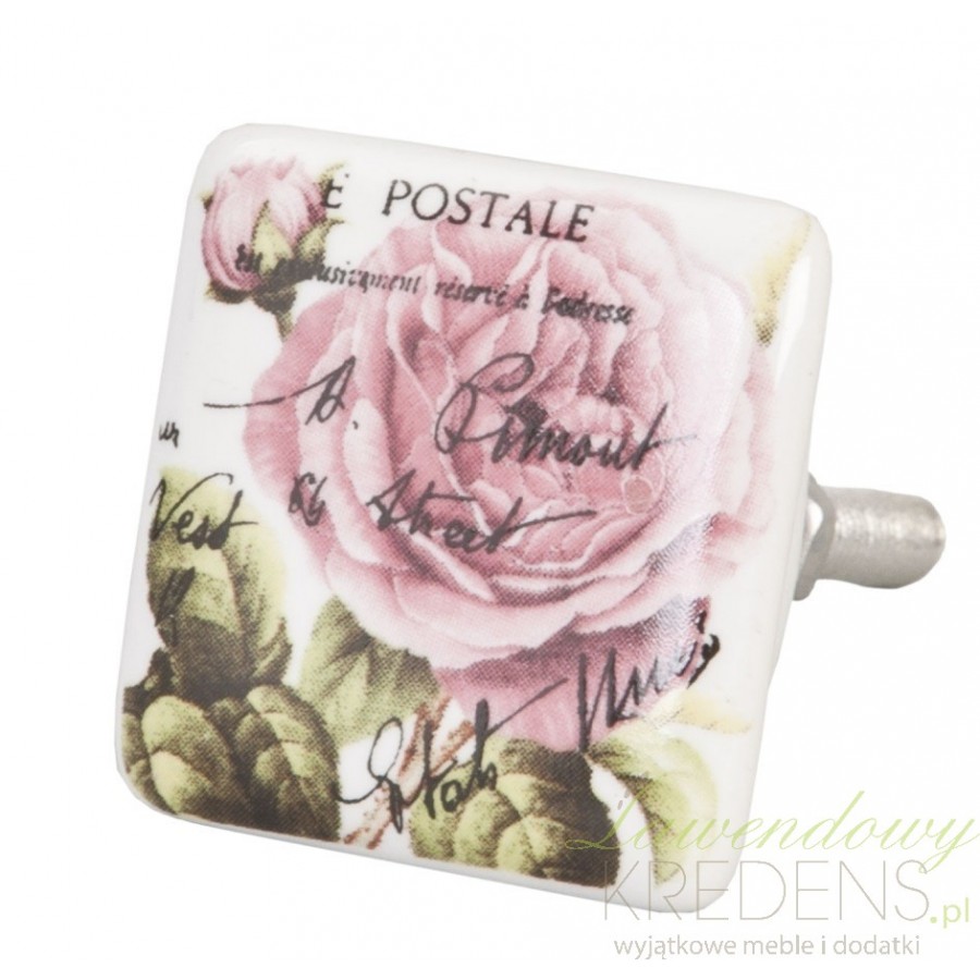 Kwadratowe gałki do mebli w stylu prowansalskim, pięknie ozdobione różanym motywem i angielskimi napisami!