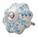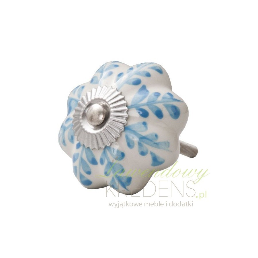 Wyjątkowe gałki meblowe, które są połączeniem metalowej podstawy w ceramicznej zabudowie w kszatłcie ośmiokątnego kwiatka. Białe gałki zostały stylowo ozdobione błękitnymi wzorkami, które przypominają listki kwiatów. Gałki do mebli to idealne dodatki do wnętrz klasycznych czy w stylu prowansalskim, którym nie brakuje ciepła i wdzięku!