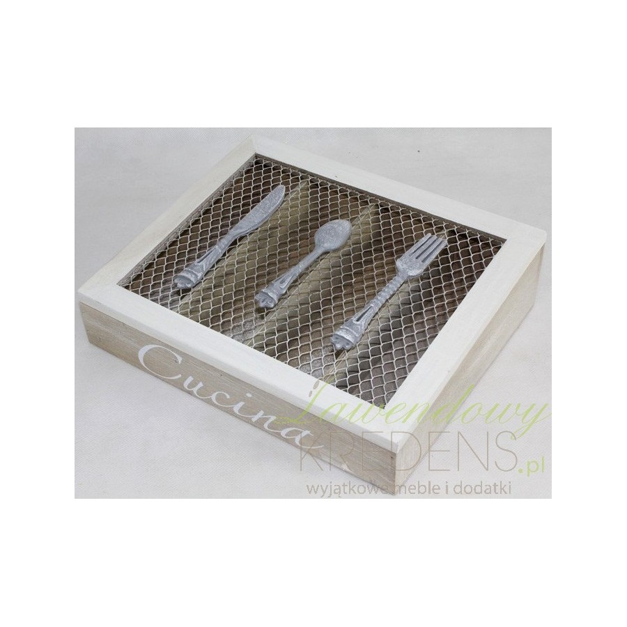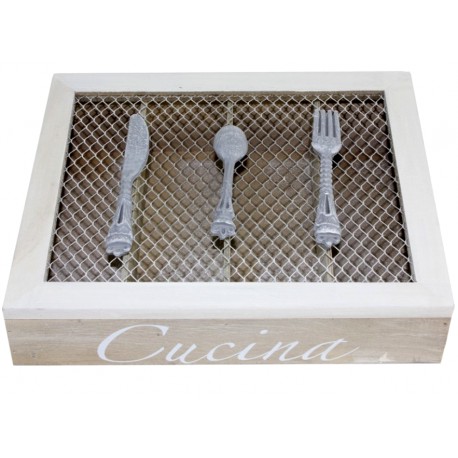 Piękny, drewniany pojemnik na sztućce otwierany wieczkiem do góry, który podzielony zostały na cztery przegrody odpowiednio na łyżki, łyżeczki, widelce i noże. Taka forma organizacji przestrzeni pozwoli zachować Ci każdy rodzaj sztućców na swoim miejscu bez względu na okoliczności. Dodatkowo pudełko jest specjalnie zdobione napisem Cucina oraz trójwymiarowymi: nożem łyżką i widelcem!
