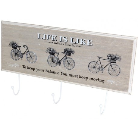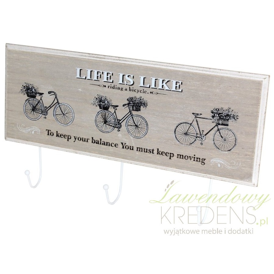 Wieszaki ścienne, których podstawę tworzy drewniany obrazek, na którym w piękny sposób przedstawione zostały trzy rowery starszego typu z kwiatami w koszykach. Kompozycja dopełniona jest napisami w języku angielskim i delikatnymi przetarciami przy krawędziach. Wieszaki drewniane dobrze wyglądały będą zarówno jako wieszaki na płaszcze jak i na kuchenne ściereczki!