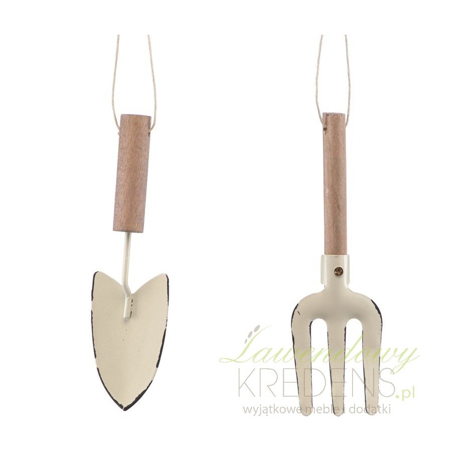 Łapatka i widełki: metalowe zakończenia w kolorze beżowym na drewnianych trzonkach to świetne dodatki do ogrodu, które wprowadzą prawdziwie swoiski klimat! Wspaniałe jako ozdoba lub pierwsze narzędzia małych ogrodników!