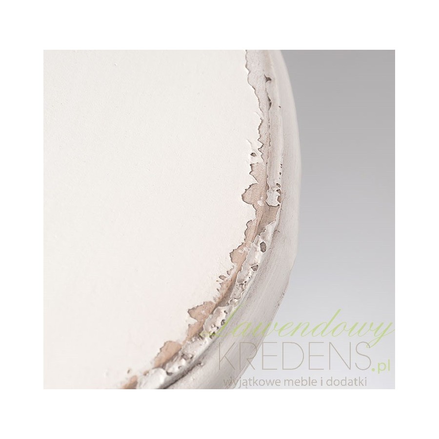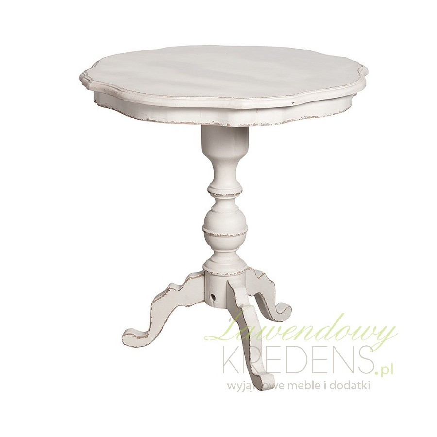 Biały stolik w stylu prowansalskim z kształtną, zmieniającą średnice nogą ustawioną na drewnianym trójniku. Taka konstrukcja i stosukowo niewielki blat sprawiają, że stolik Belldeco idealnie nadaje się jako stolik kawowy jako dodatkowy stolik w gabinecie. Zachwycisz się genialnie postarzaną powierzchnią!