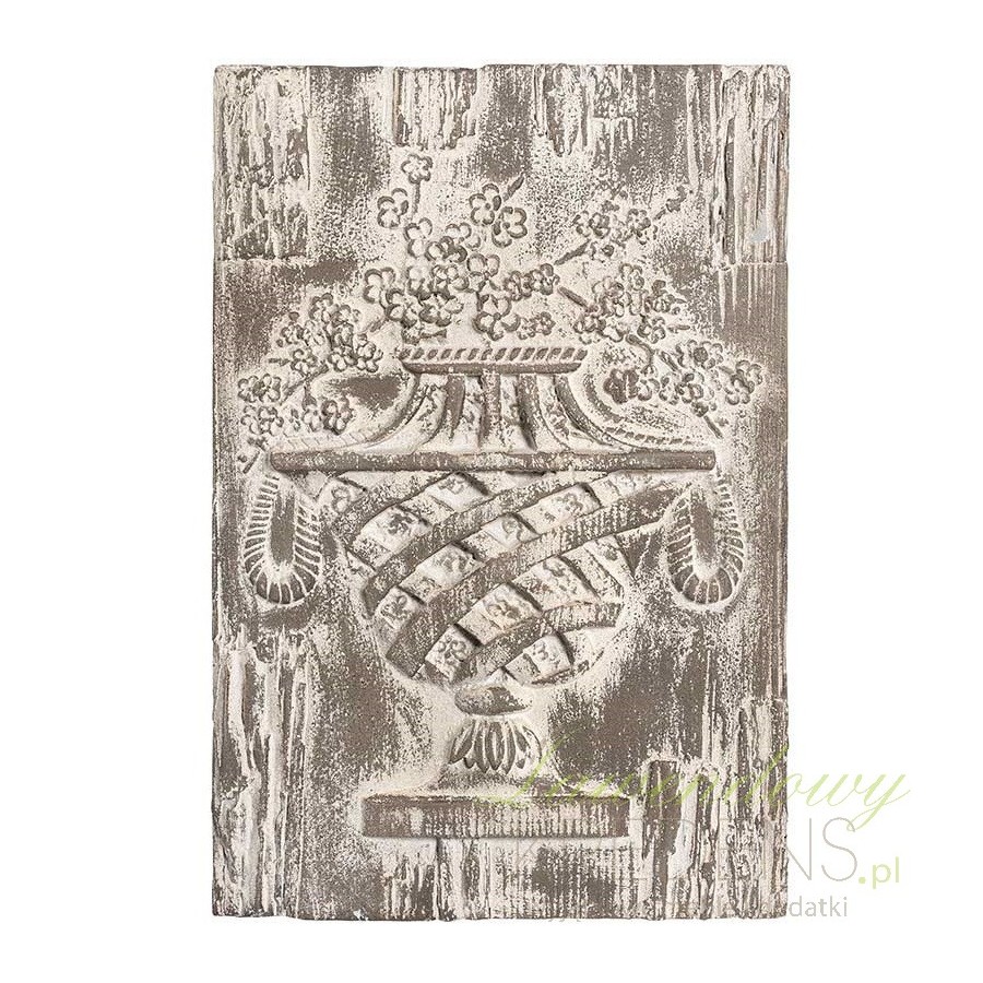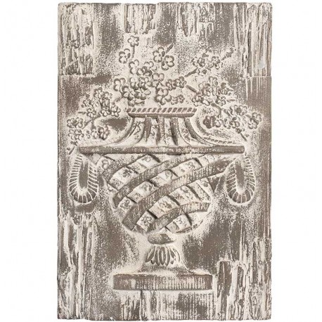 Niesamowity dekor ścienny, który przestwawia szeroku wazon z wiszącymi uchwytami, z którego wnętrza wyłaniają się wijące się kwiaty. Przedstawiona scena ukazana jest poprzez wypukłe kształty, które zostały dodatkowo stylowo bielone i delikatnie szczotkowane. Całość prezentuje się okazale i świetnie pasuje do klasycznych wnętrz!