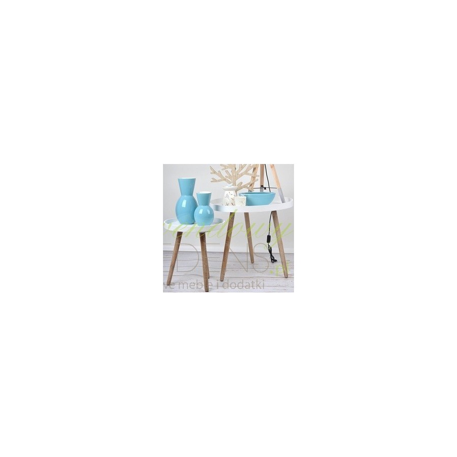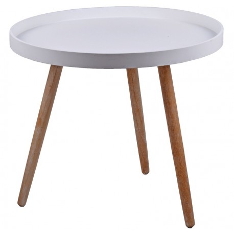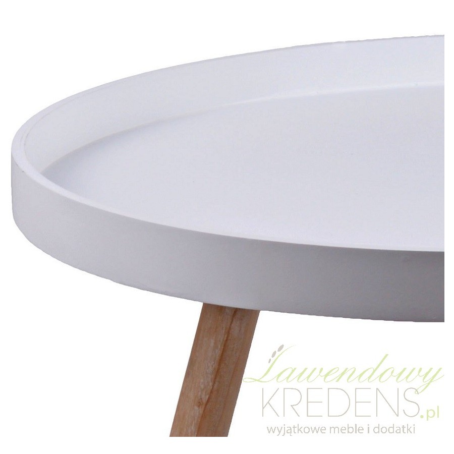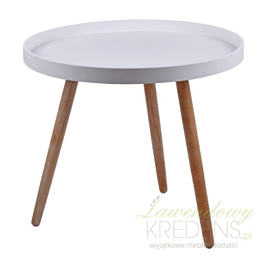 Trójnożny stolik w stylu skandynawskim z białym okrągłym blatem z podwyższona krawędzią! Dla Twojej wygody!