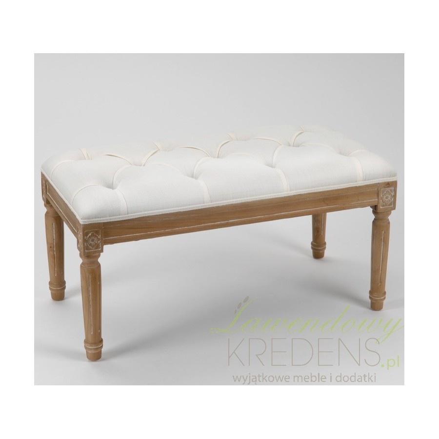 Wysokiej jakości meble prowansalskie, z delikatnie rzeźbionymi i miejscami bielonymi nogami, które doskonale współgrają z białym materiałem tapicerowanej góry. Prezentowana ława tapicerowana to mebel, który świetnie sprawdzi się w sypialni, salonie czy nawet w holu. Ława pikowana to kwintesencja prowansalskiej wygody i eleganckiego stylu.