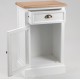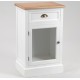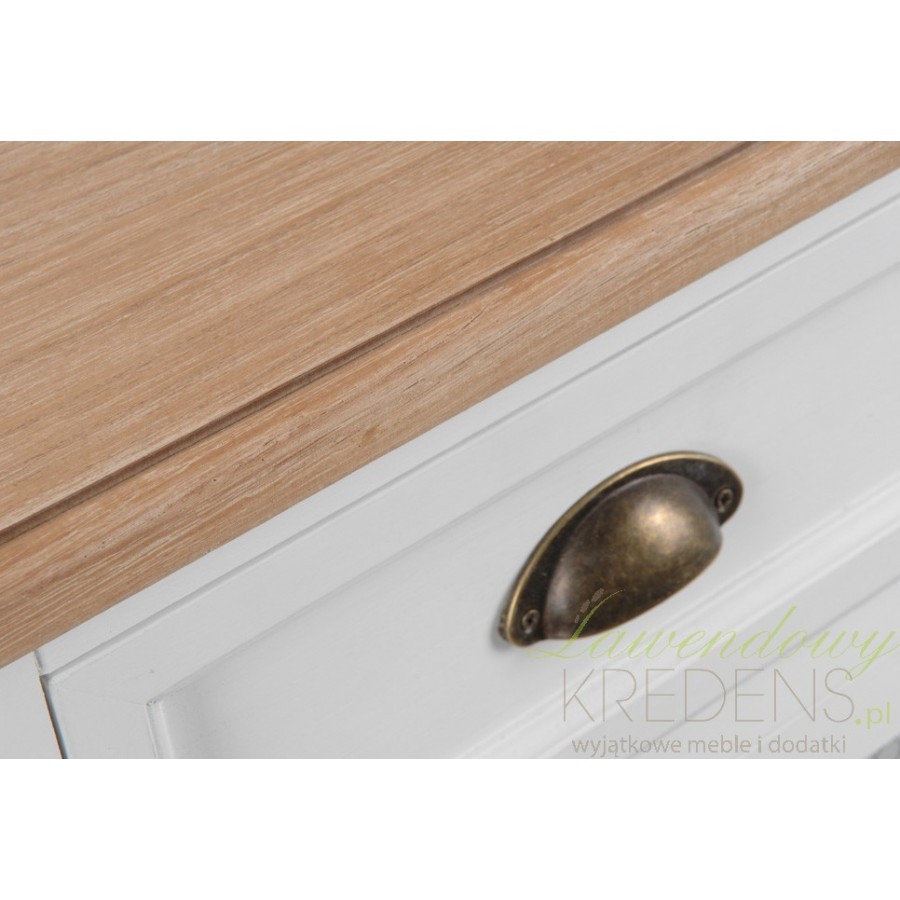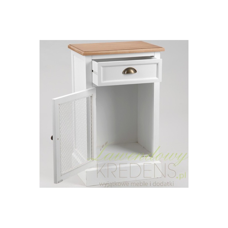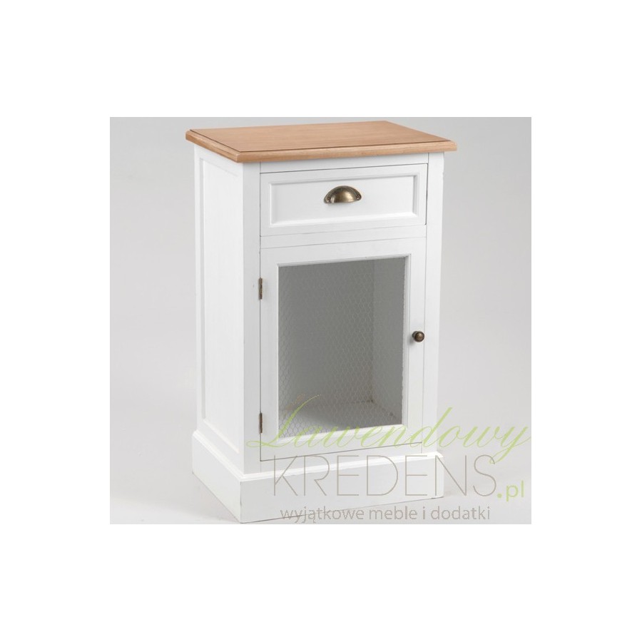 Niska szafka w stylu prowansalskim, idealna jako szafka nocna do Twojej sypialni. Przeszklone drzwiczki półki piękne komponują sie z bielą drewna, nad całością zaś dominuje delikatne przełamanie w postaci blatu w naturalnym drewnianym odcieniu. Wykończenie szafki nocnej stanowią metalowe uchwyty, ułatwiające otwieranie półki i szuflady.