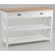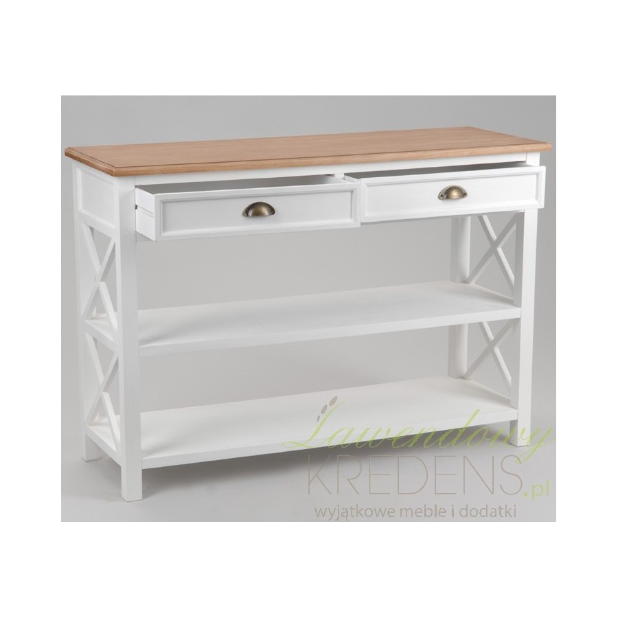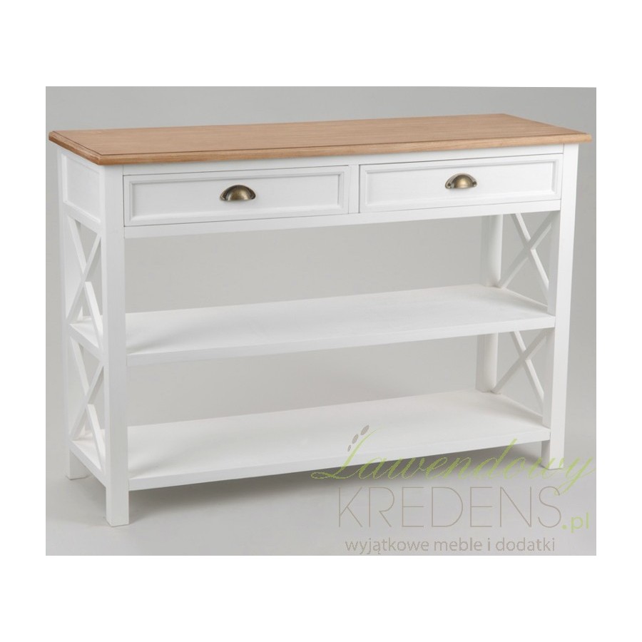 Atrakcyjna wizualnie konsola prowansalska z dwiema półkami i szufladami, zwiększając Twoją przestrzeń użytkową!