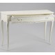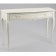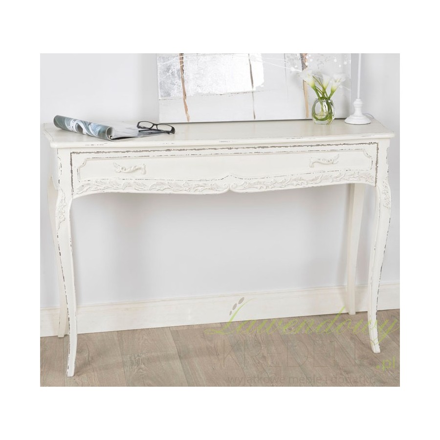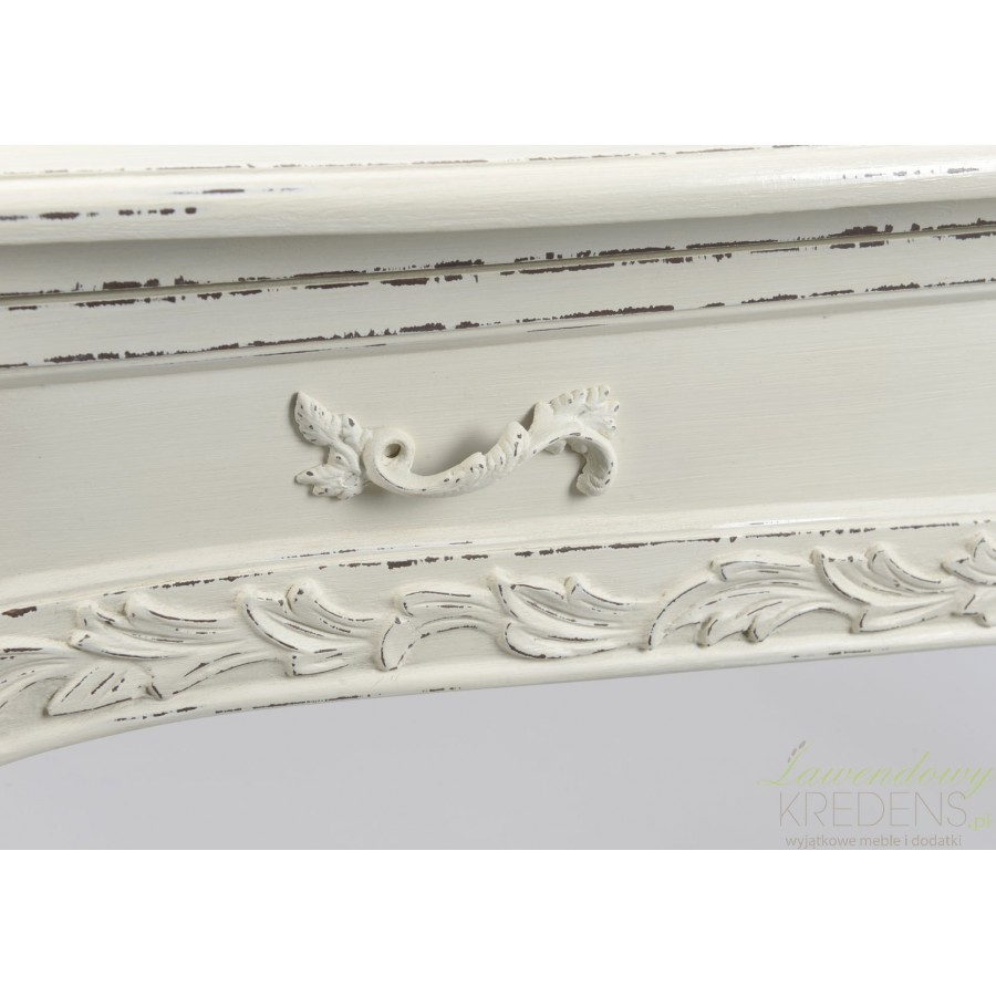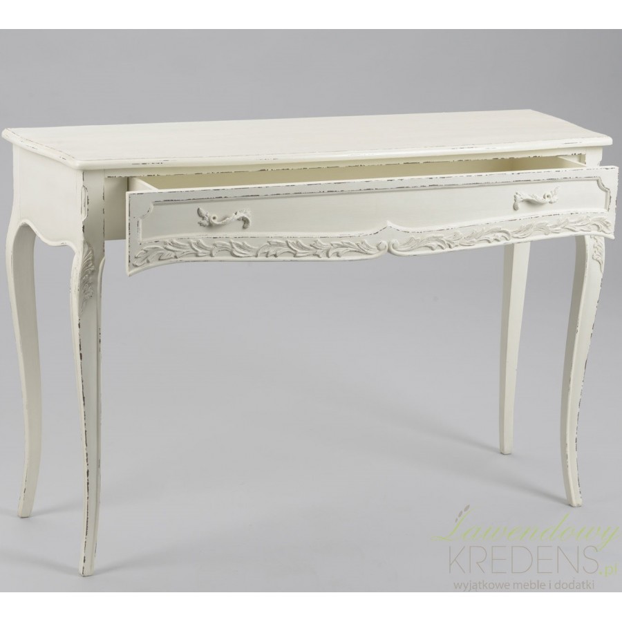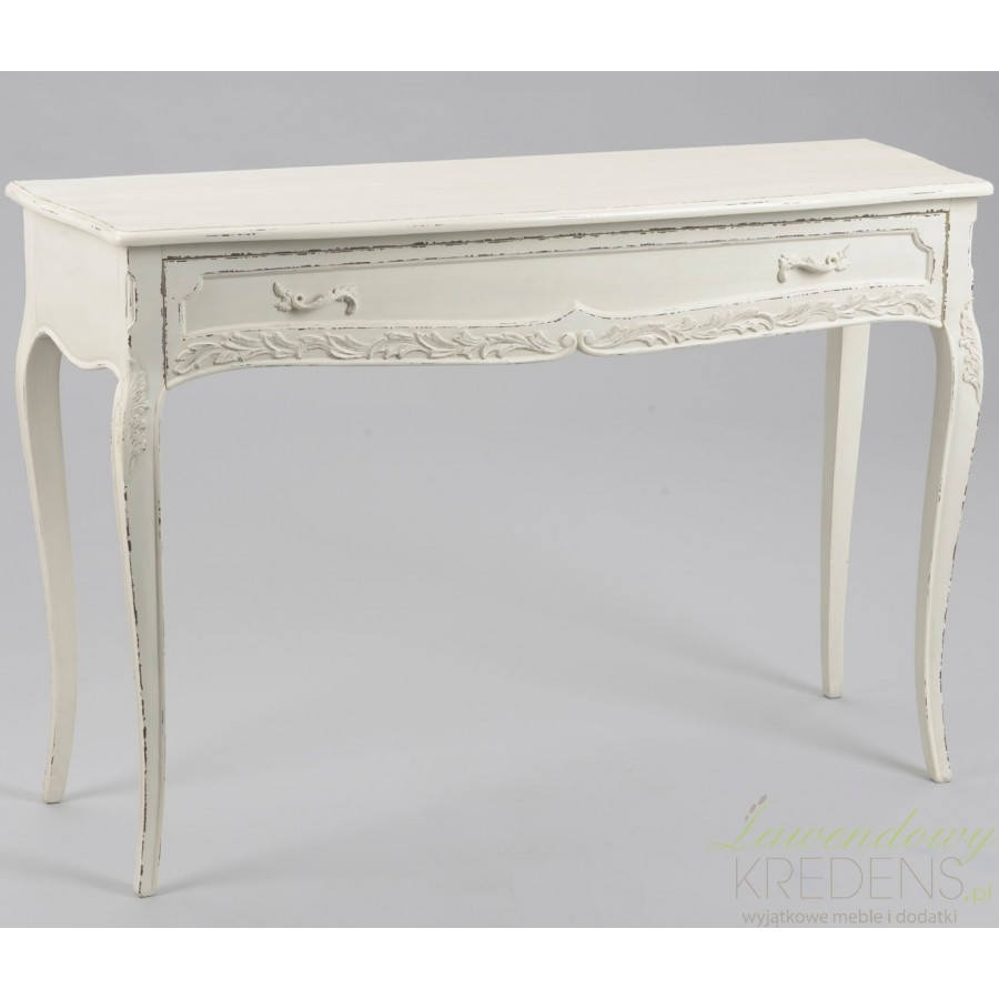 Duża konsola w stylu francuskim w cudownymi rzeźbieniami na krawędziach szuflady ustawiona na smukłych nogach.