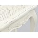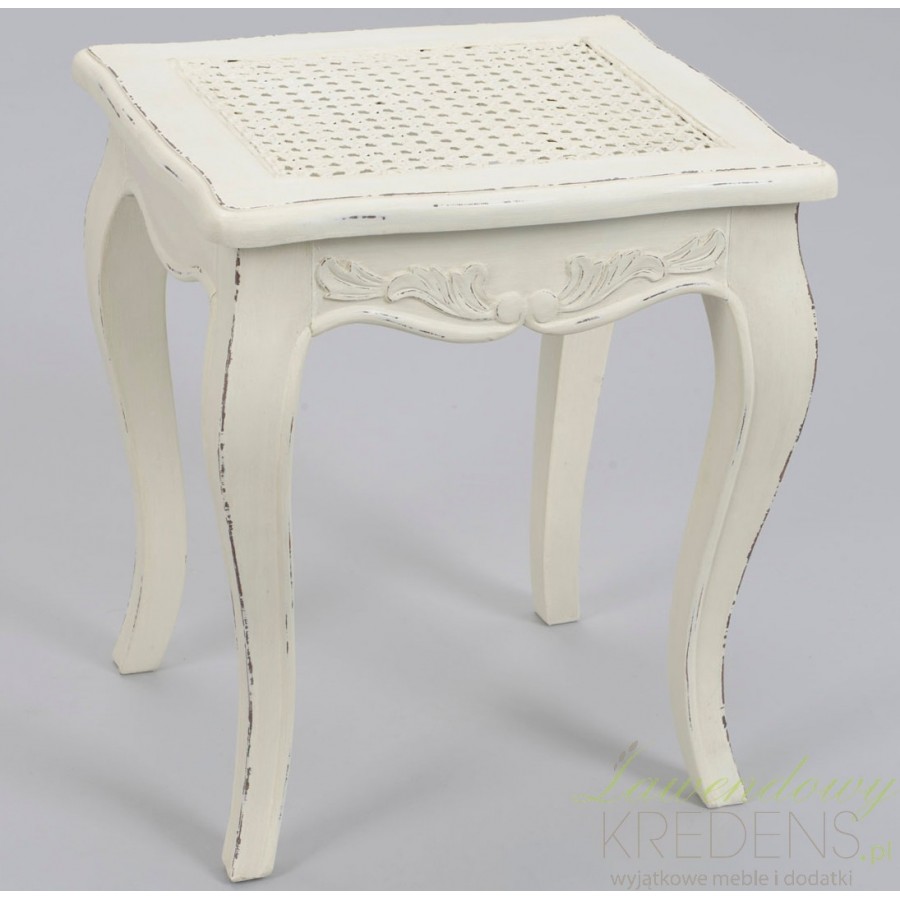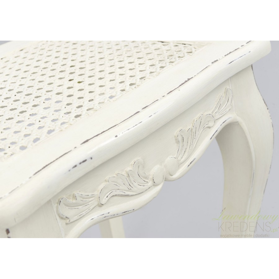 Biały stołek w stylu francuskim ze specjalnie wykonanym, siatkowanym siedziskiem i pięknymi zdobieniami w postaci delikanych, płaskich wyżłobień. Doskonały, gdy zjawią sie dodatkowi gościa, a także jako stołek dla dzieci! Ustawiony na czterech wyprofilowanych nogach
