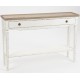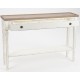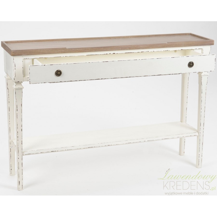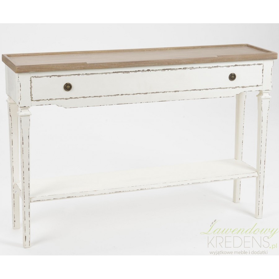 Wykończona z dbałością o szczegóły konsola drewniana z blatem w kolorze naturalnego drewna, który wyróżnia się na tle kremowo - białych nóg i frontu szuflady. Subtelnie podkreślające urok konsoli specjalne otarcia i przetarcia dopełniają całość kompozycji, a pojemna szuflada i dolna półka czynią ten mebel niezwykle praktycznym!