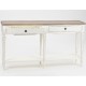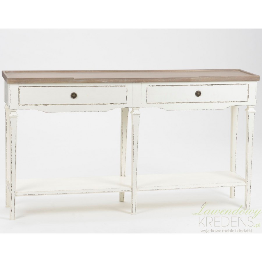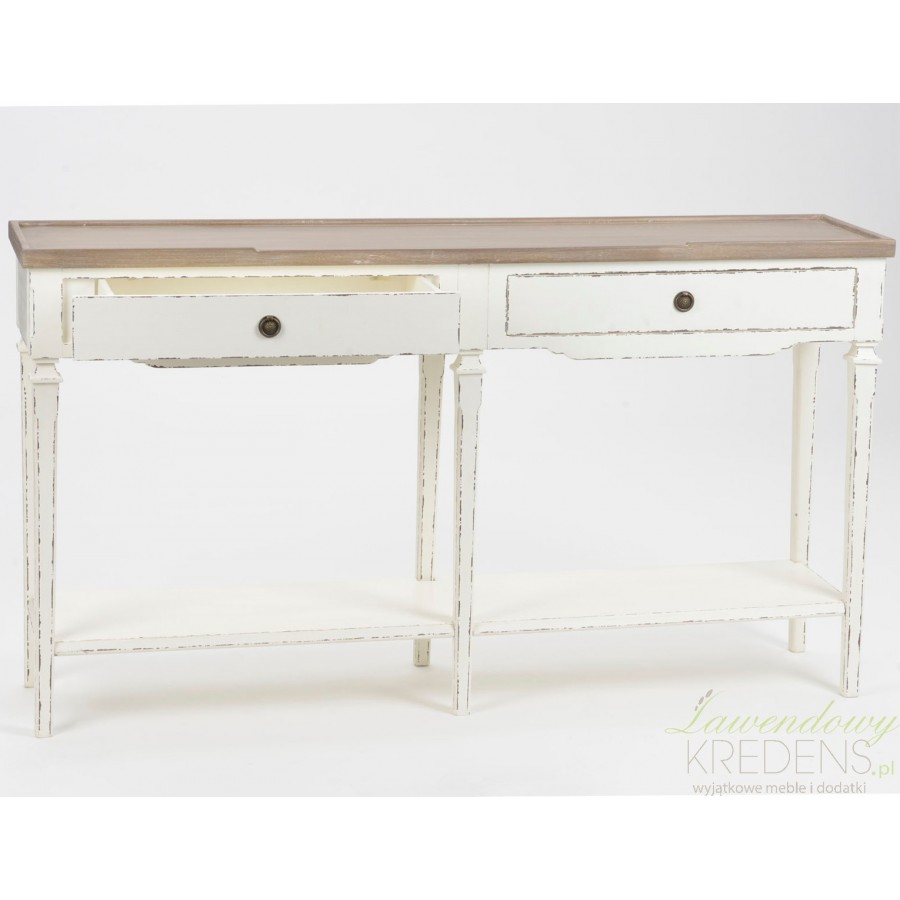 Kremowo - biała konsola drewniana ze śladami specjalnych przetarć, widocznych zwłaszcza na krawędziach nóg oraz zarysach szuflad to konsola z półką w dolnej części, która zapewnia dodatkową przestrzeń użytkową!