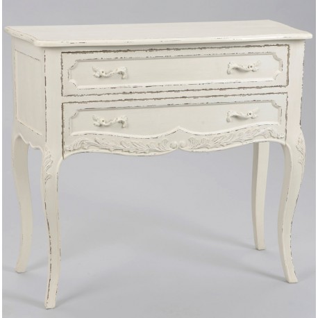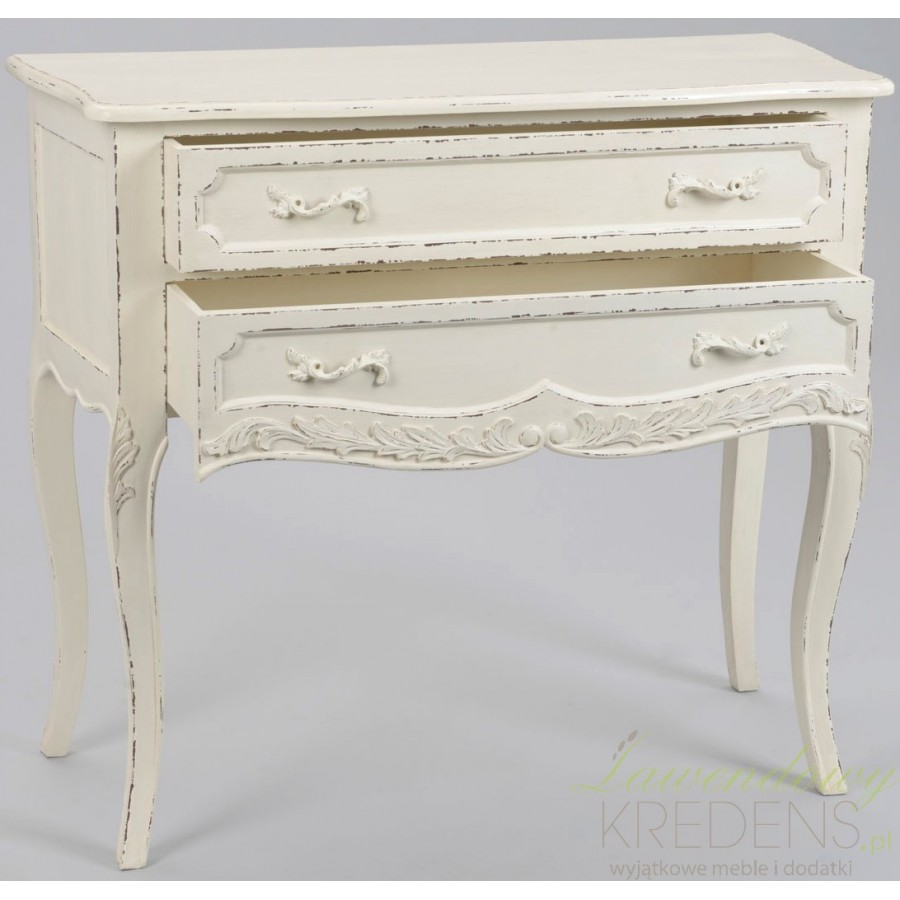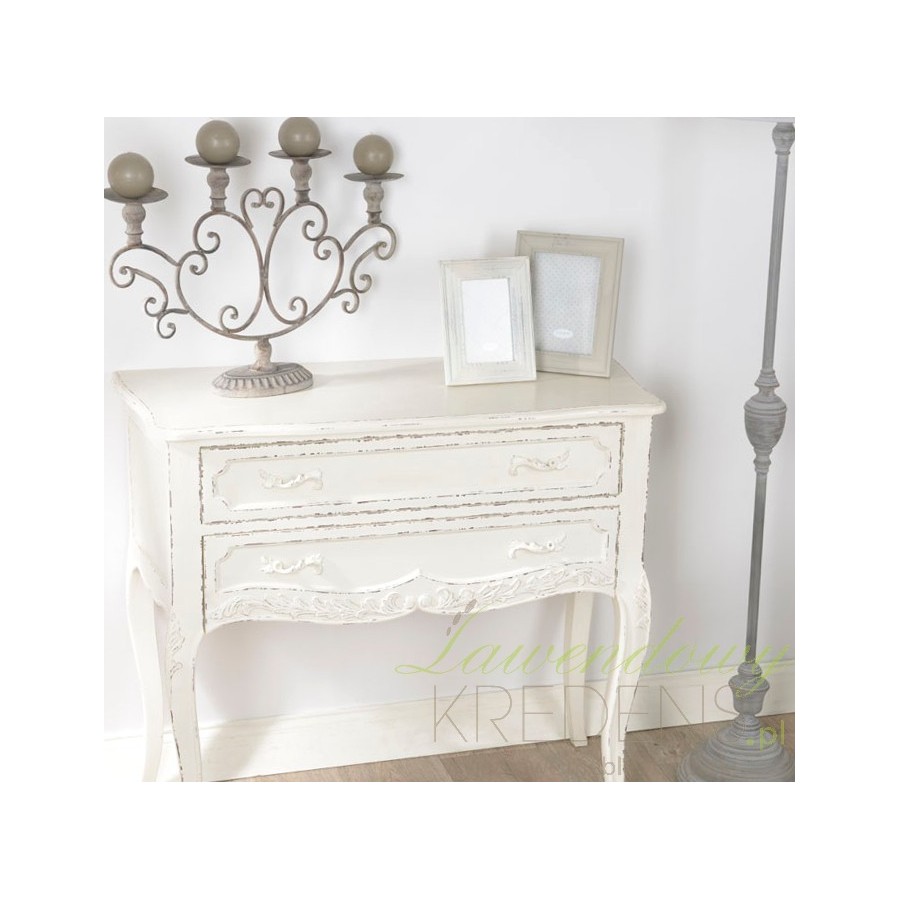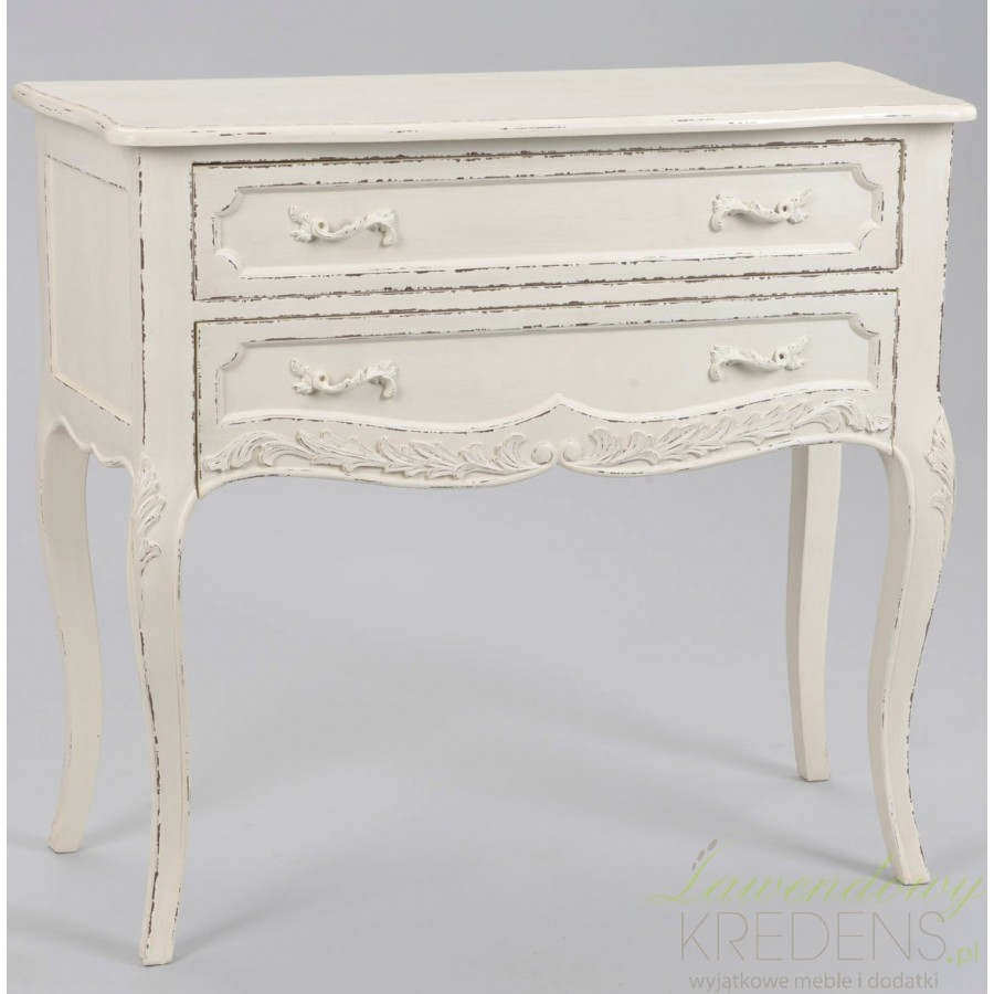 Smukła komoda w stylu francuskim w kolorze białym z dwoma szufladami, których krawędzie zdobią specjalne przetarcia!