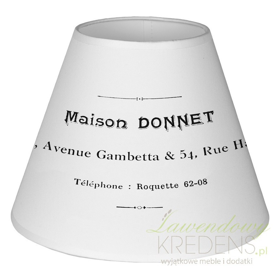 Abażur w stylu prowansalskim wyprodukowany przez polską firmę French Home to elegancki abażur w formie ściętego stożka, który pasował będzie to Twojej lampy doskonale. Poszycie abażura to wysokiej jakości bawełna, którą można czyścić na mokro. Dopełnieniem klimatu prowansalskiego są napisy w języku francuskim, które ukladają się w adres!