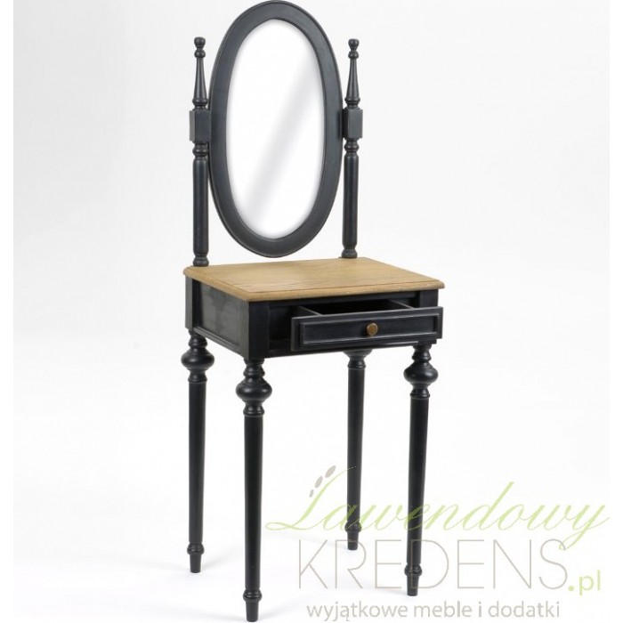 Ustawiona na zgrabnych, długich nogach toaletka prowansalska w kolorze czarnym, z dużym owalnym lustrem umieszczonym pomiędzy dwoma dekoracyjnymi palikami. Dodatkowym elementem wyróżniającym meble prowansalskie z tej serii jest jasny, kontrastujący z resztą blat, który kolorystycznie współgra z małym uchwytem do jedynej szuflady!