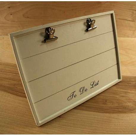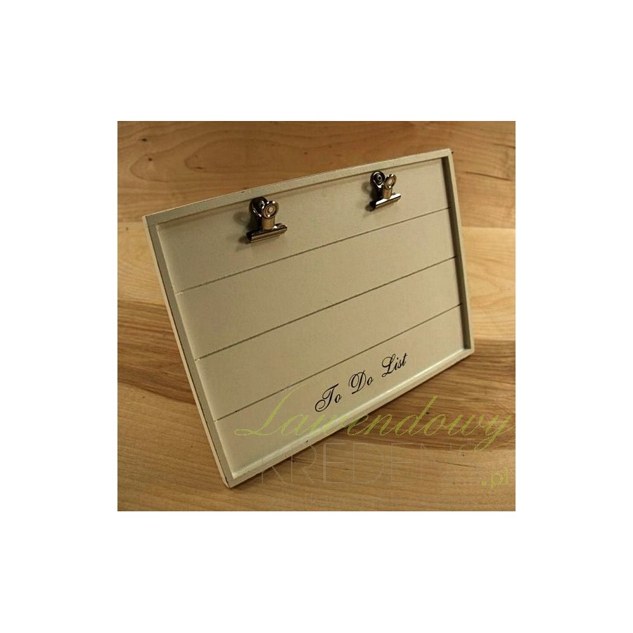 Jednolita kolorystycznie drewniana tablica z napisem na dole: "To Do List" i dwoma klipsami, któe zawsze chętnie przyjmą Twoją listę zadań i liczne notatki, abyś już więcej o niczym nie zapomniał! Prosta, niewymyślna konstrukcja z pewnością doskonale wkomponuje sie w kuchenną badź pokojową przestrzeń Twojego domu!