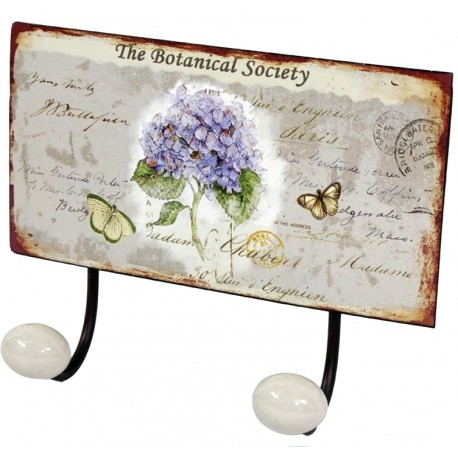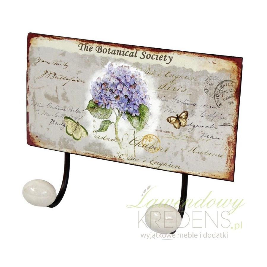 Prześliczny wieszak prowansalski z kolorową metalowa tabliczką ukazującą gałązkę kwitnących, niebieskich kwiatów na tle napisów, znaczków i stempli. Charakterystycznym elementem tabliczki są widoczne na całym obwodzie zardzwienia i zadrapania powierzchni, co czyni wieszaki ścienne wyjątkowymi dodatkami!