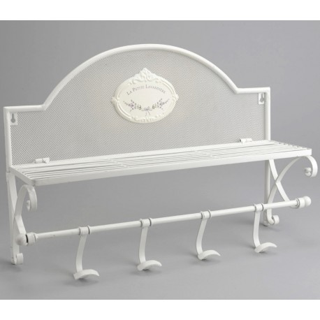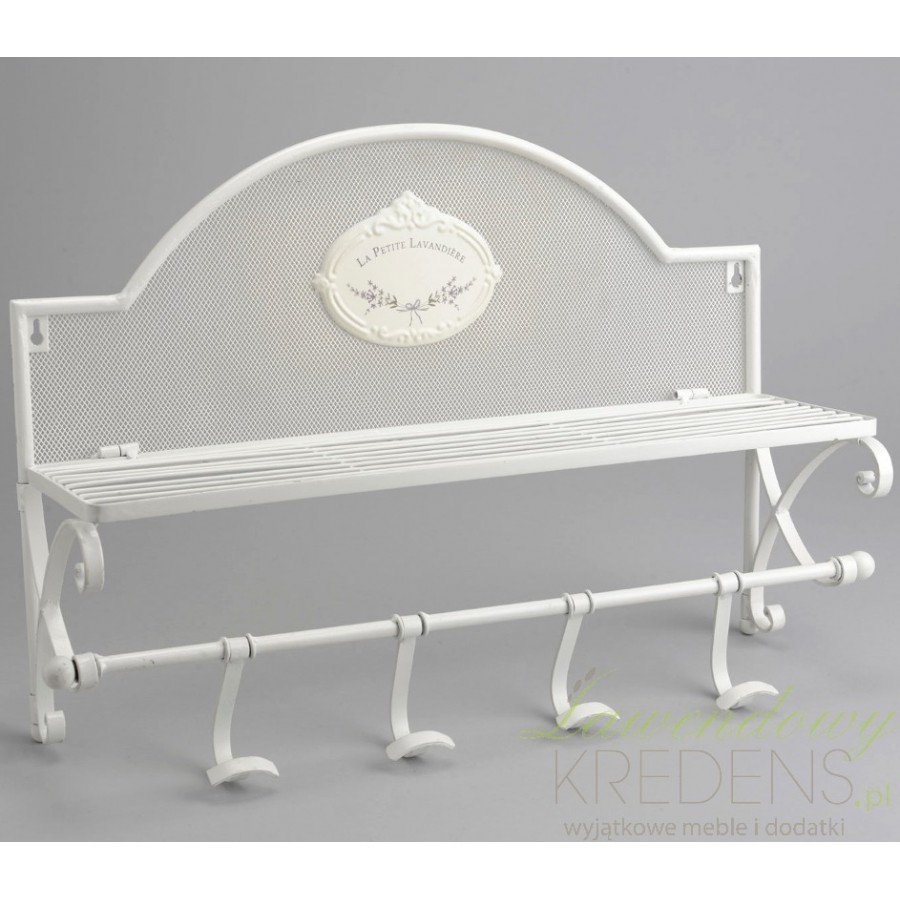 Biała półka z wieszakami, która w łazience prezentować się będzie godnie i co ważniejsze funkcjonalnie. Nieodłączny w stylu prowansalskim motyw lawendy widoczny jest na górującej nad półką ozdobnej tabliczce z delikatnymi wypukłościami i napisem w języku francuskim. Podkreśl swój styl nawet w łazience!