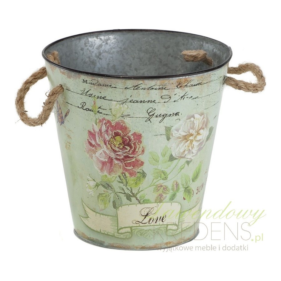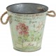 Cynowe osłonki na doniczki w kształcie wiaderka z parcianymi uchwytami i wzorem rożanym na powierzchni! Polecamy!