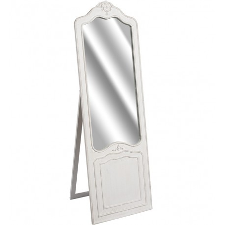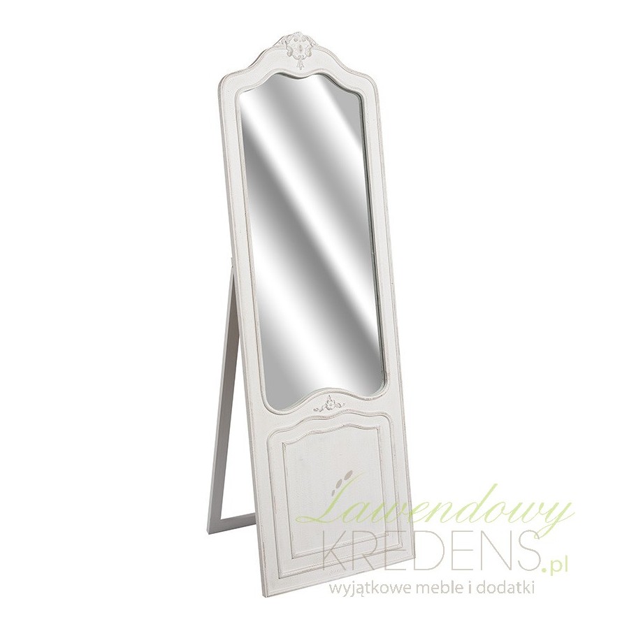 Wysokie, stojące lustro postarzane marki Belldeco w kolorze antycznej bieli, która harmonizuje i razjaśnia przestrzeń.